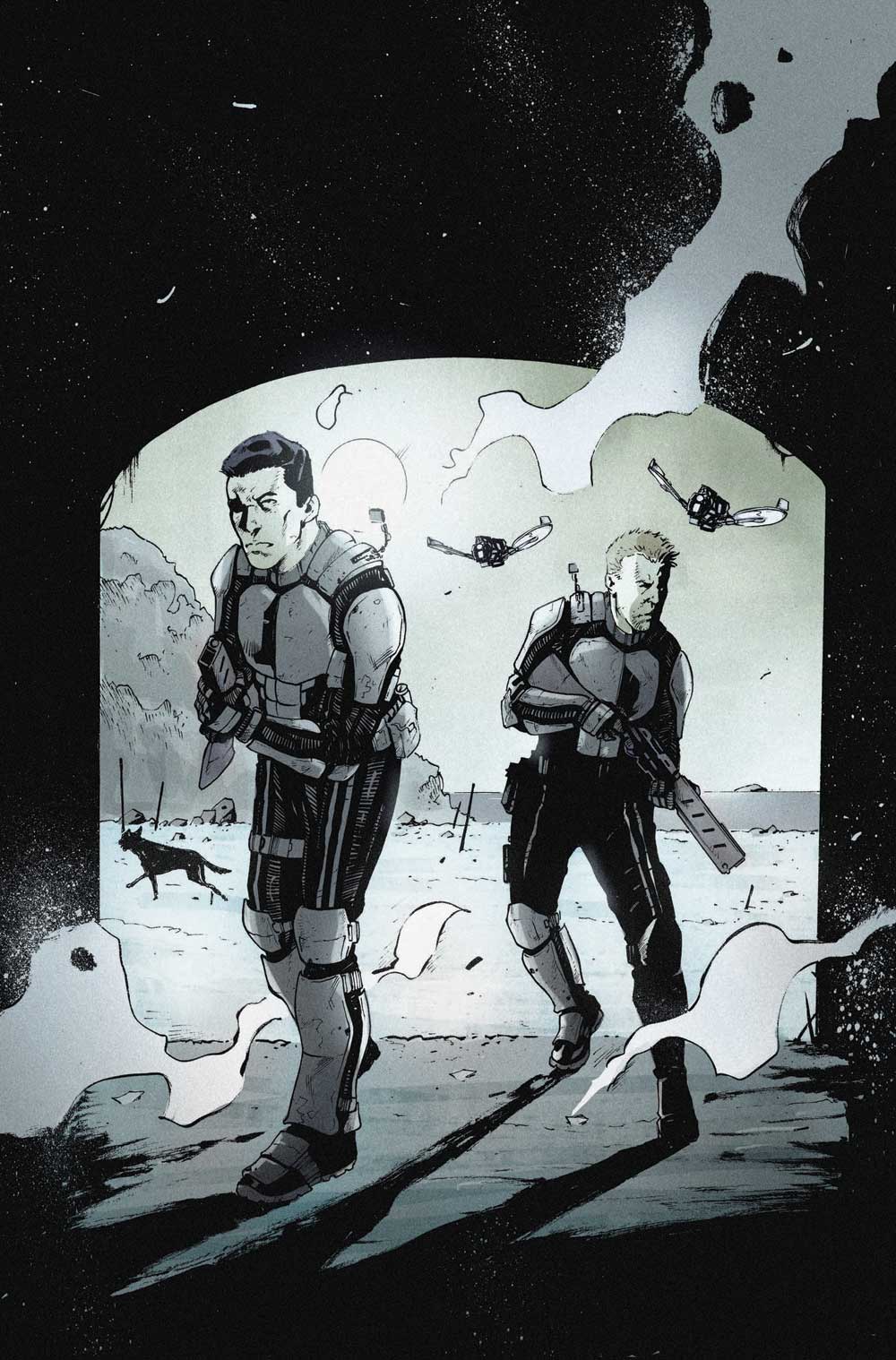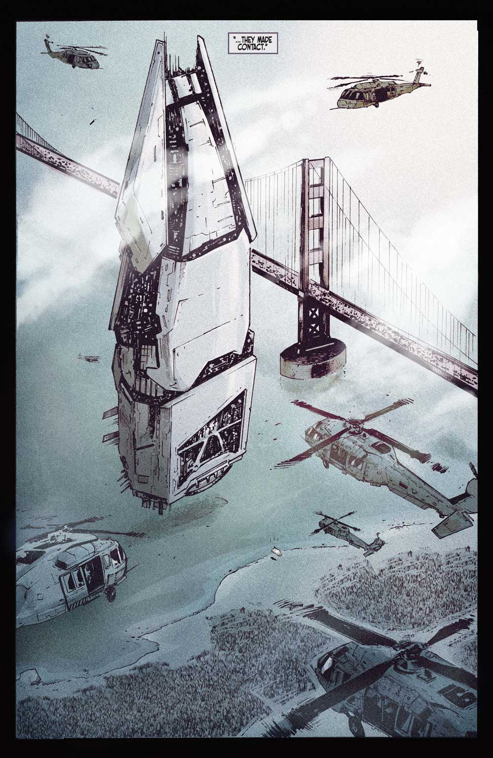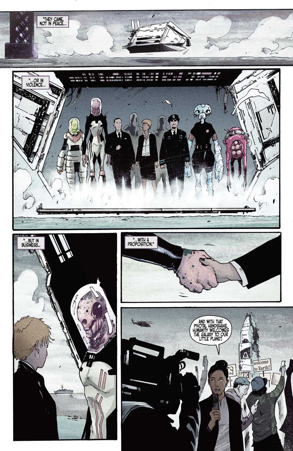Zack Kaplan: The entire story is told as if the reader is watching a news story/documentary on cable news. Our narrator is hard-hitting journalist Julia Campbell, a former war reporter who’s taking the screws to the head of the ESA, Tom Rutgers. Through this interview, which I think of as a mini Frost/Nixon style story throughout the entire series, we learn all the ramifications on our planet now that we run an alien spaceport. And again, both Campbell and Rutgers are right and wrong, and it’s definitely a storyline set up to create debate. But it’s not just a framework to inform the audience. There’s a story and a conflict there, too, and there’s a big payoff in the end.