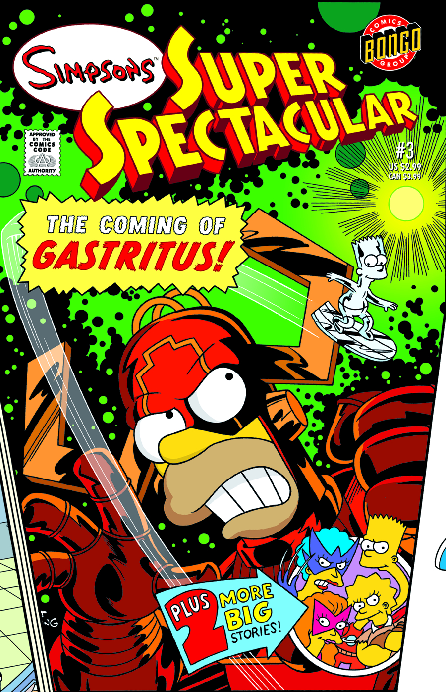 Three superior superheroic stories in one big ish! Meet Gastritus, the swallower of whole galaxies and a lot of pork rinds. Then, Stretch Dude, Clobber Girl, and Battle Baby find themselves on the wrong side of the law when the local League of Women Voters outlaws superheroes. And, finally, some of Radioactive Man's female friends from the Superior Squad grab the spotlight in a stirring adventure.