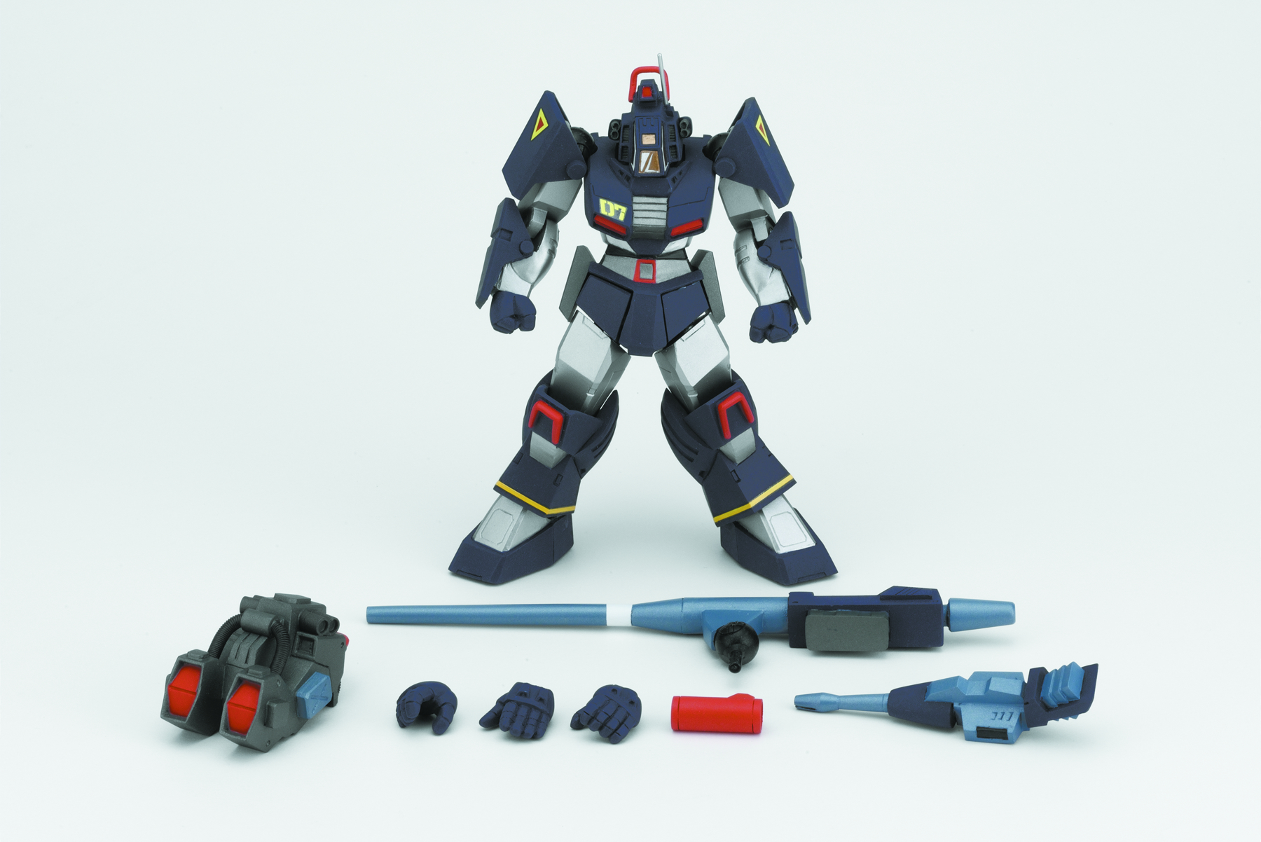 Dougram based on the TV anime series, Fang of the Sun Dougram. The figure measures 6" tall and comes with multiple articulation points, plus backpack reactors, a set of interchangeable hands, and a small arsenal of weapons. Plus, a unique display stand for a myriad of positions. Window box packaging.