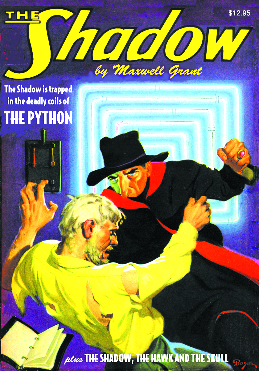 The Knight of Darkness battles master criminals in two classic pulp thrillers by Walter B. Gibson. Lamont Cranston is trapped in the deadly coils of "The Python" as he seeks to unravel the sinister plans of the murderous serpent of crime. Then, in "The Shadow, The Hawk, and The Skull," the Dark Avenger battles two master villains - the Hawk, a European jewel thief, and the grotesque blackmailer called "The Skull."