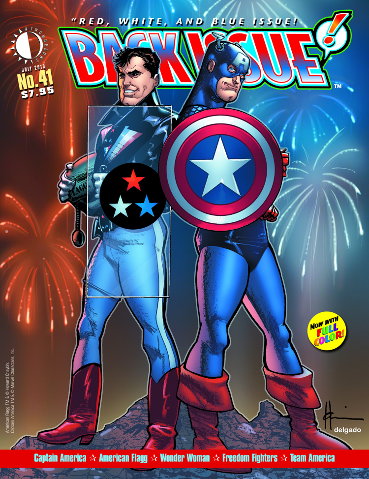 Celebrates Independence Day with the "Red, White, and Blue" issue, saluting comics' most popular patriots! Captain America gets a star-studded study, with articles examining his Bronze Age highlights as well as the Red Skull's history. Plus, Howard Chaykin's groundbreaking