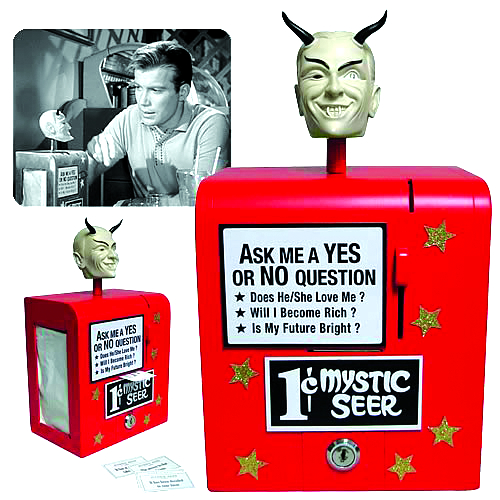 The Twilight Zone episode "Nick of Time" that starred William Shatner. Complete with napkin holder and menu holder - just like in the show - it features a working coin mechanism and can act as a bank. It even dispenses "fortunes"! Meticulously crafted of polystone and steel, the life-size Mystic Seer Replica is a colorful replication that measures about 13 1/2" x 7 1/2" wide x 6" long and comes with a Certificate of Authenticity. Can't you just see this in your living room or office?