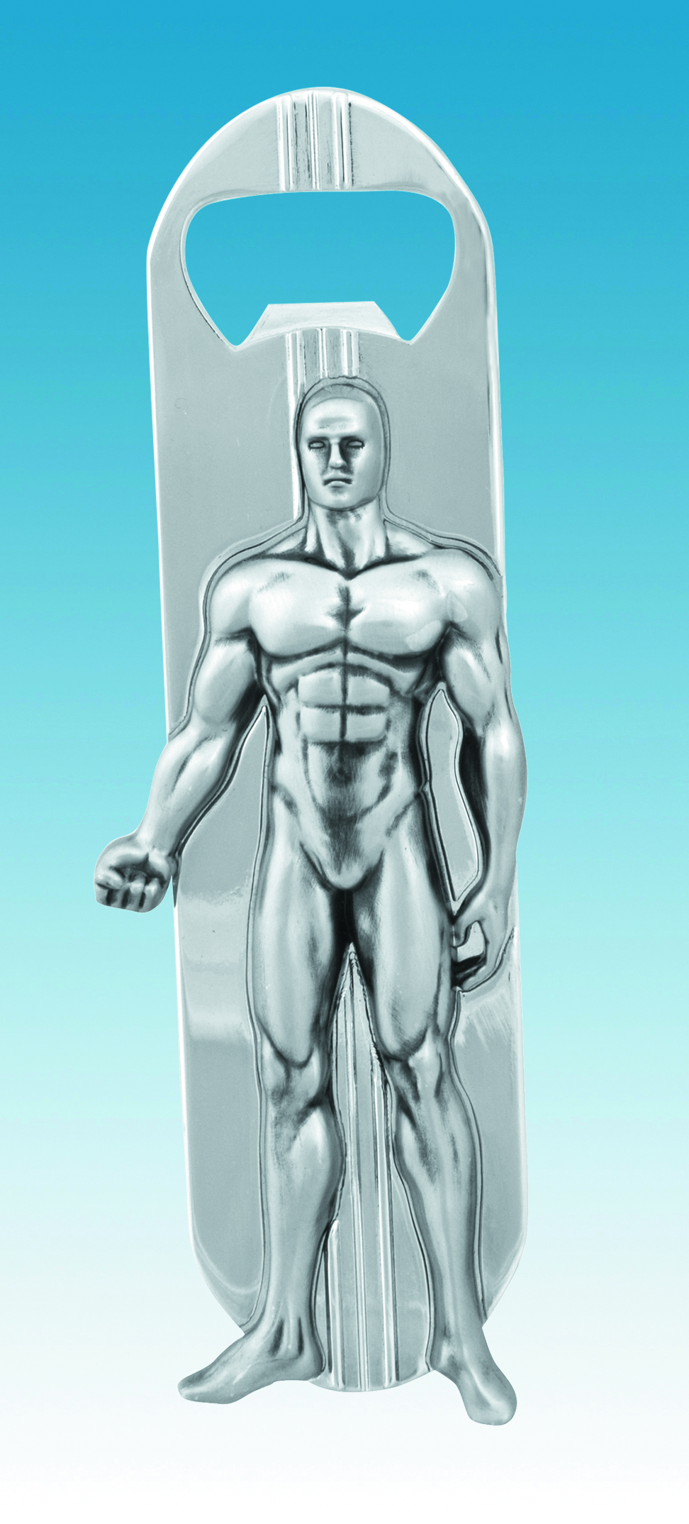 A Diamond Select Release! The first ever Silver Surfer bottle opener! We know Galactus hungers, but does he also get thirsty? Does he ever dispatch his heralds to find him a cool, frosty beverage planet to drink? Well, now you can use the power cosmic to crack open a cold one with this shiny bottle opener shaped like the Silver Surfer and his board! Crafted in solid metal, this surefire conversation piece should be in every comic fan's kitchen, for when your guests want a cold beverage and simply crying out "Make Mine Marvel" won't do the trick! Measuring six inches long, this original DST product is packaged in a collector's case with a full-color wrap.