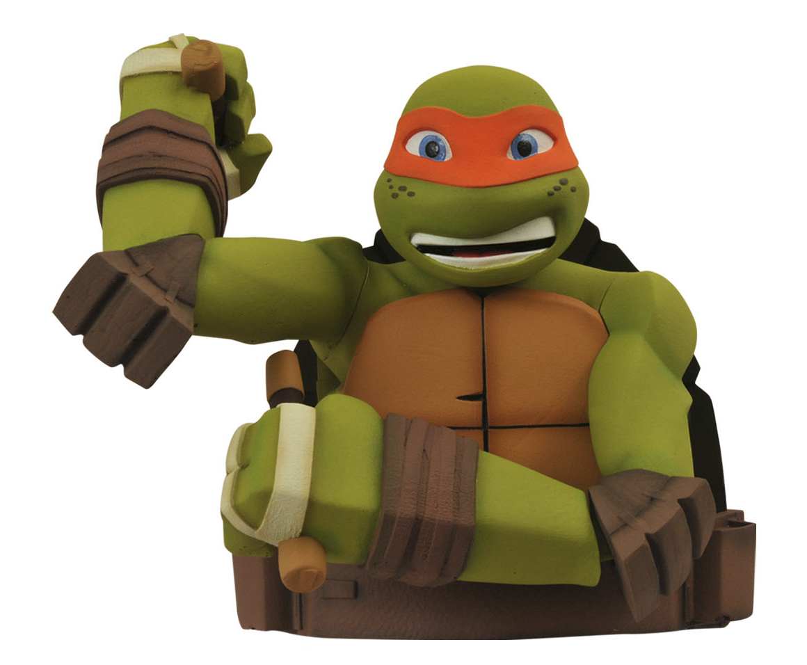A Diamond Select Toys Release! Save your money for a rainy day -- or your next pizza craving - with this new line of TMNT banks from DST! These bust banks of the four Ninja Turtles are based on their most recent cartoon appearances, and each wields his trademark weapons. WIth a coin slot in the back and an access door on the bottom, each bank stands approximately 8 inches tall. Designed and sculpted by Art Asylum!