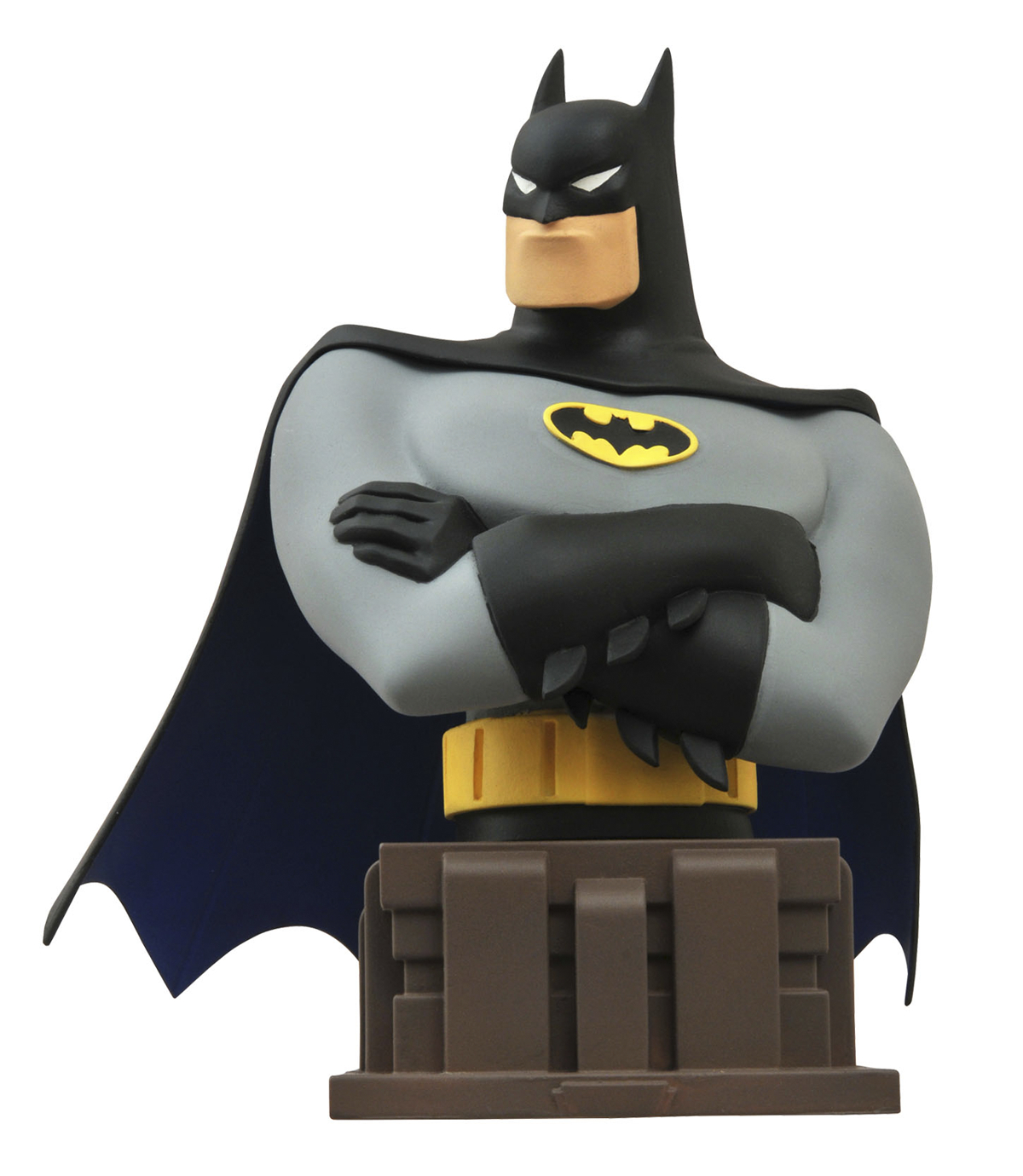 A Diamond Select Toys release! Evildoers beware - Batman is kicking off the next big bust line from Diamond Select! Based on the iconic and revolutionary Batman: The Animated Series, this line of 6-inch resin busts will depict Batman and his friends and foes just as you remember them from the cartoons! The Caped Crusader himself will be the first release in the series, with his arms crossed atop an art-deco base inspired by the show's distinctive style. Packaged in a full-color box with a certificate of authenticity. Sculpted by Steve Varner Studios!