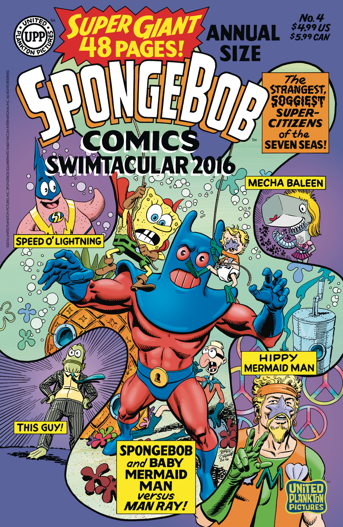Swimtacular is a saturated celebration of super heroics! In "SpongeBob BabysitterPants" Mermaid Man is turned into a mewling infant in a Mermalair mishap. And guess who babysits him? Then comics legend Neal Adams depicts a new more relevant, more groovy Mermaid Man in a story we didn't have to call "The Green Harpoon's Challenge!" Also: advertisements for next year's Saturday morning cartoon cause a crisis in SpongeBob's life, Pearl has a comic convention at the Krusty Krab, and Patrick becomes the new embarrassingly clad hero Speed o' Lightning!