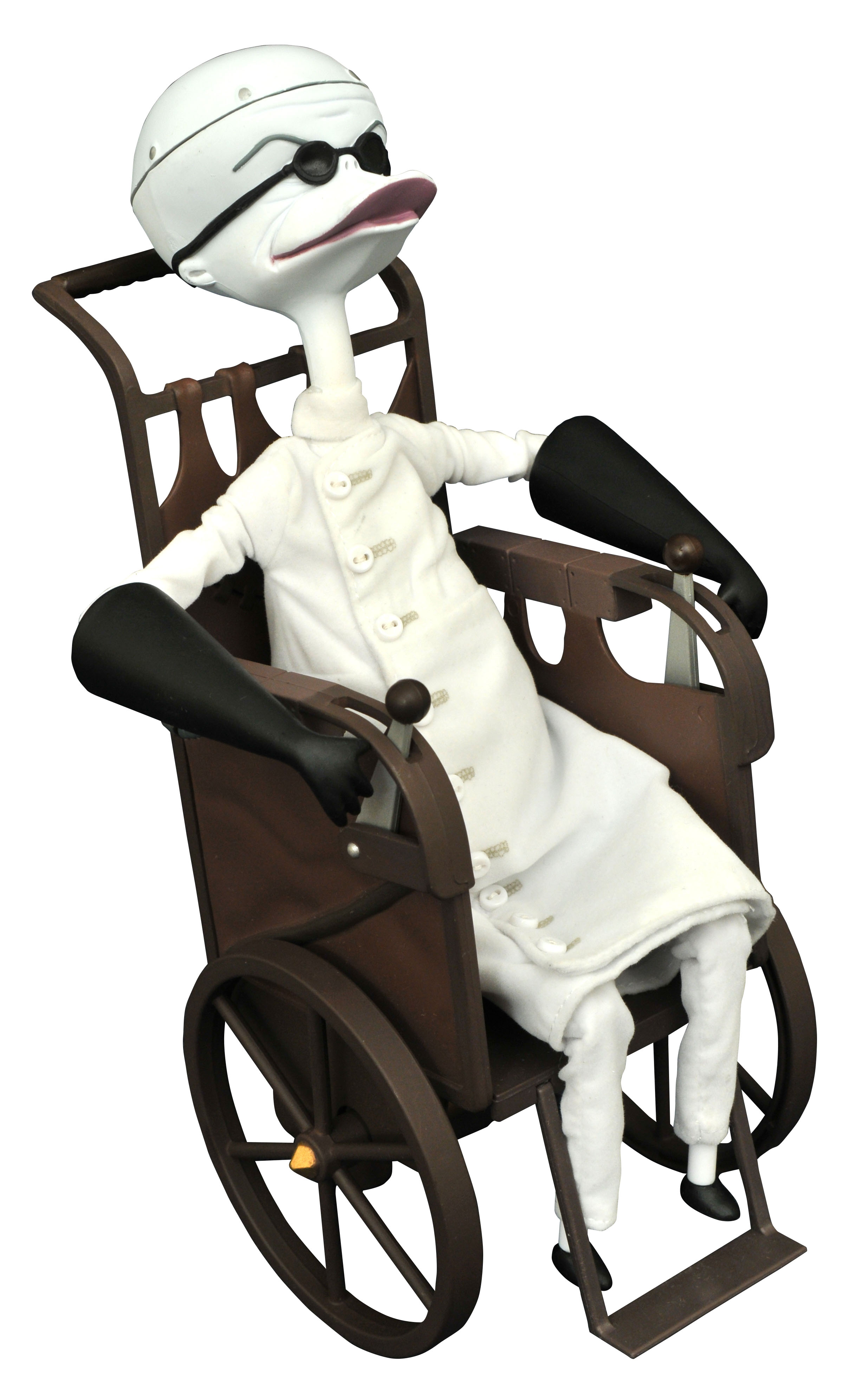 A Diamond Select Toys release! The doctor is in! Sally's creator Dr. Finkelstein is the newest straight-from-the screen articulated doll in the Nightmare Before Christmas doll line, with a real cloth costume, a real opening head and really removable brains! (NOTE: Brains are not real.) Measuring approximately 10 inches tall when standing, Finkelstein is in scale with Jack and Sally, and sits in a wheelchair with rolling wheels. Limited to 1,993 pieces, Finkelstein looks like he just stepped off the screen! Packaged in a full-color window box.