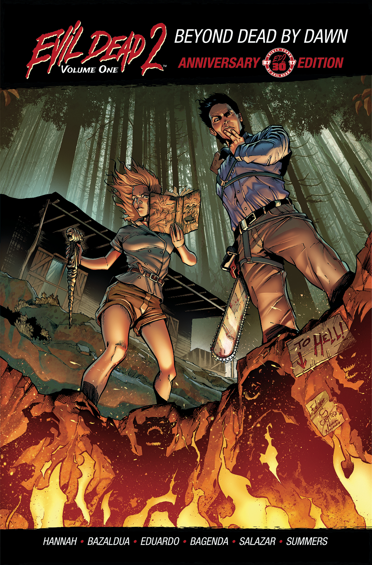 Evil Dead 2: Beyond Dead by Dawn Volume 1 collects the complete first mini-series, including the super rare 6-page prequel to the sequel before the other sequel. Picking up where the Sam Raimi and Bruce Campbell movie left off, Annie and Ash are trapped in Hell, fighting their way through a demon horde to rescue her parents, using only the Ex-Mortis and the Kandarian dagger. Is it enough? Or will they kick Ash?