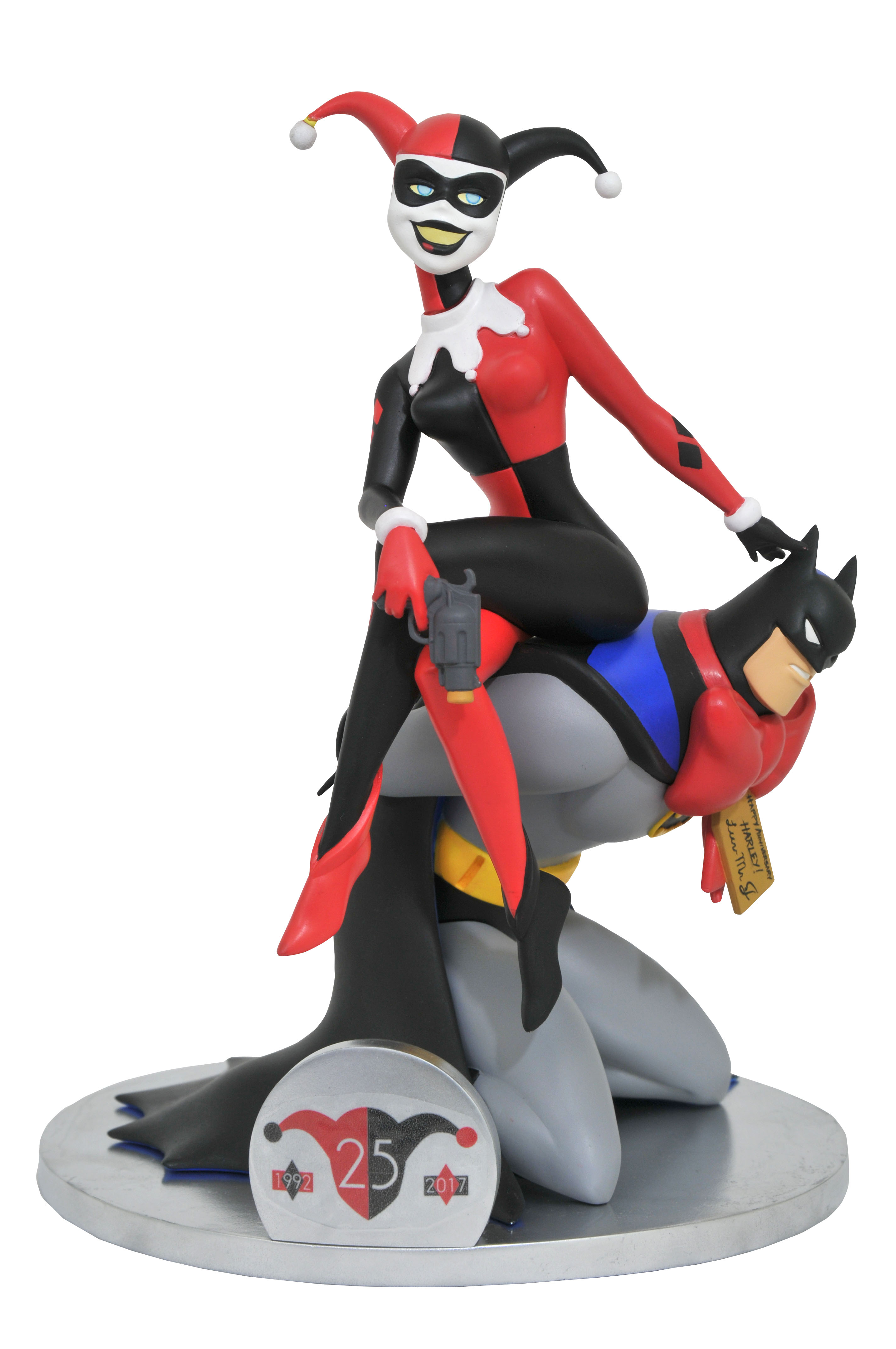 A Diamond Select Toys Release! Harley Quinn is turning 25, but you get the present! The first-ever Deluxe DC Gallery PVC Diorama celebrates Harley's 1992 debut on Batman: The Animated Series with a new diorama of the Joker's gal pal sitting on top of a gift-wrapped Batman -- an anniversary present to Harley from her Puddin'! Measuring almost 10 inches tall, this diorama features detailed sculpting and paint applications and comes packaged in a full-color window box. Sculpted by Varner Studios!