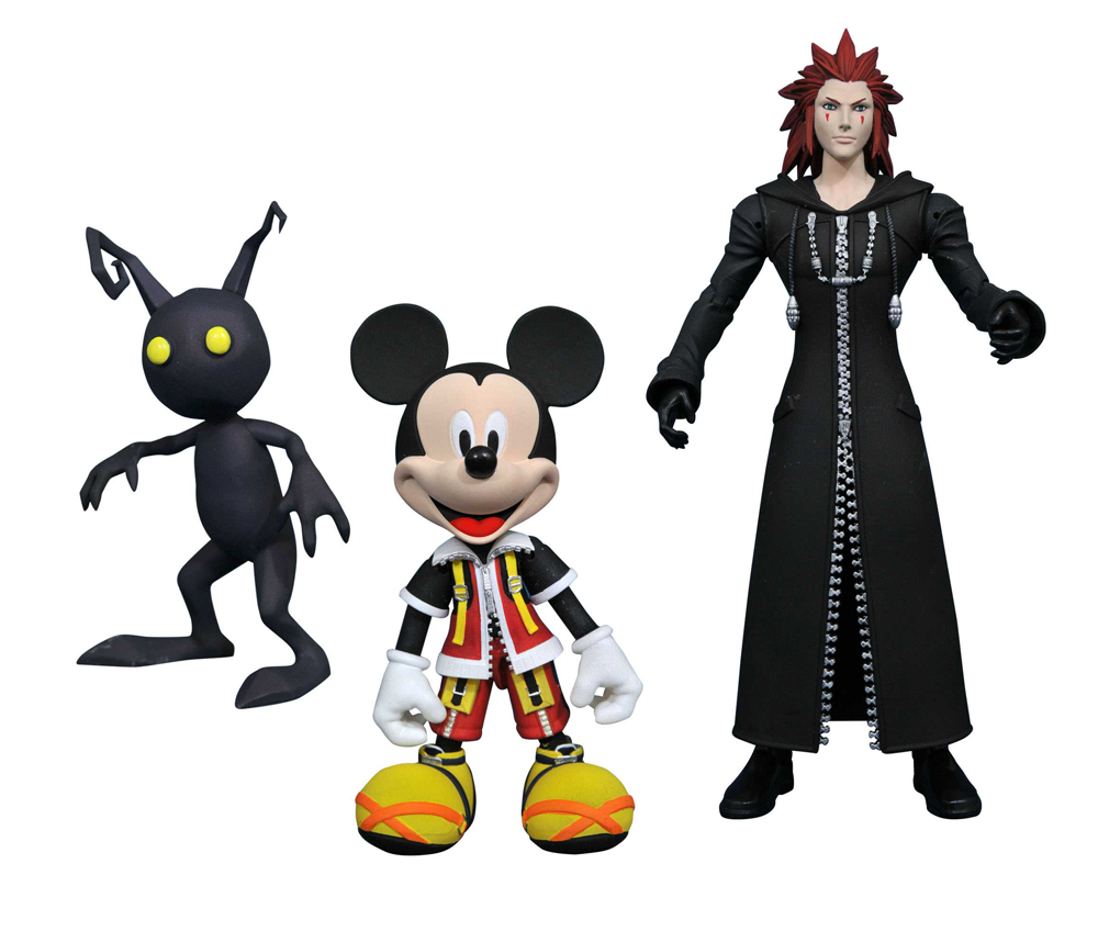 Kingdom Hearts series, these action figure three-packs include some of the game's most popular characters. Mickey Mouse comes with Axel and a Heartless Shadow, and each figure measures between 3 and 7 inches tall and features up to 10 points of articulation, as well as character-appropriate accessories, including the Starseeker keyblade for Mickey and twin chakram for Axel. Each figure three-pack comes packaged in the display-ready Select action figure packaging, with side-panel artwork for shelf reference. Sculpted by Oluf Hartvigson!