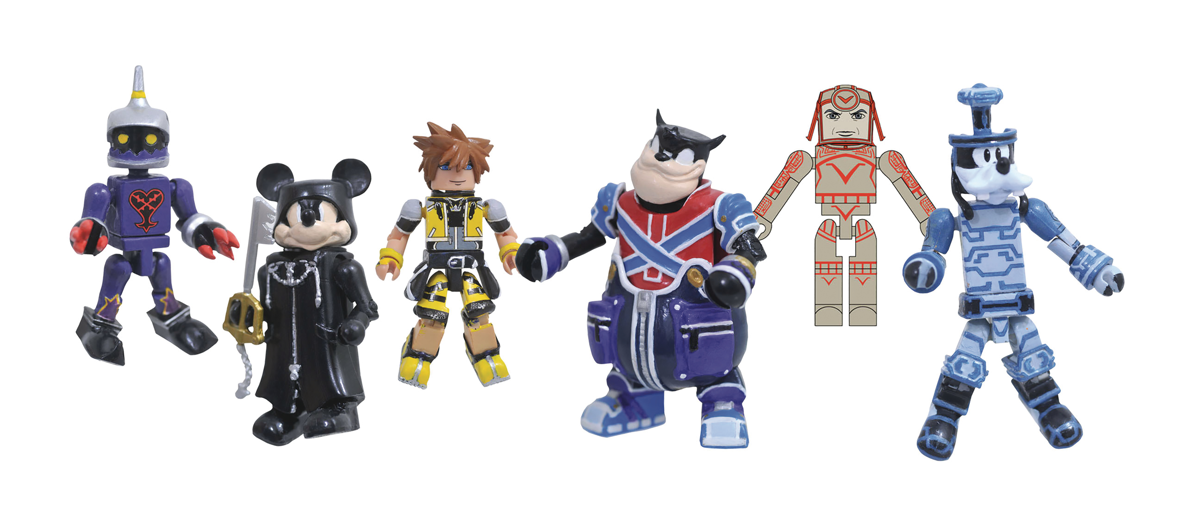 Minimates mini-figures are diving back into the world of Kingdom Hearts, and Series 2 spotlights more of Disney and Square Enix's biggest stars from the second Kingdom Hearts game! The series includes two-packs of Organization 13 Mickey with a Soldier, Master Form Sora with Pete, and an exclusive 2-pack of Space Paranoids Goofy with the villainous Sark! Each Minimates mini-figure features up to 14 points of articulation and fully interchangeable parts and accessories. Designed by Barry Bradfield.