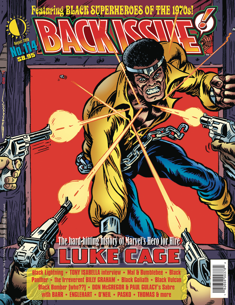 Back Issue is busting loose with Black super-heroes of the 1970s, featuring a history of Luke Cage, Hero for Hire! Plus: a retrospective of artist Billy Graham, a Tony Isabella interview, Black Lightning, Black Panther in the UK, Black Goliath, the Teen Titans' Mal and Bumblebee, Don McGregor and Paul Gulacy's Sabre, and... Black Bomber (who?). Featuring Mike W. Barr, Steve Englehart, Roy Thomas, and more, under a classic Luke Cage cover by the Irreverent Billy Graham.