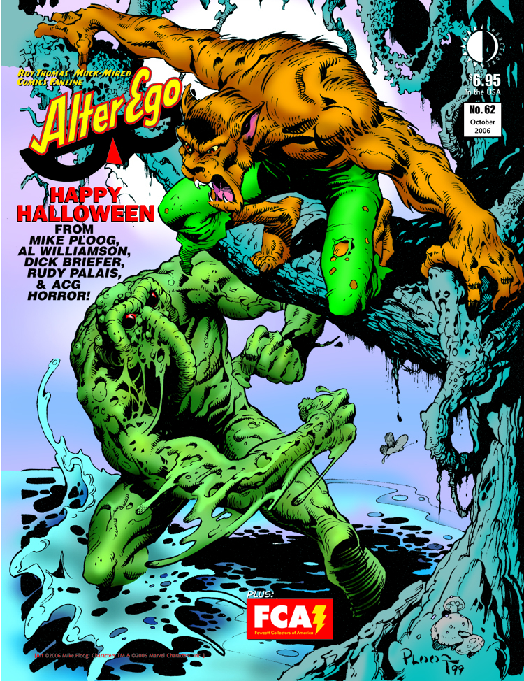 Happy Haunted Halloween Issue! With a spotlight on "Werewolves & Man-Things That Go Bump In The Night"! Featuring: a never-before-published "Werewolf by Night and Man-Thing" cover by Mike Ploog; interviews with Mike Ploog and Rudy Palais about their horror comics work, conducted by Roy Thomas and Jim Amash; and Al Williamson on his work for the American Comics Group (ACG)! Plus, rare Dick Briefer