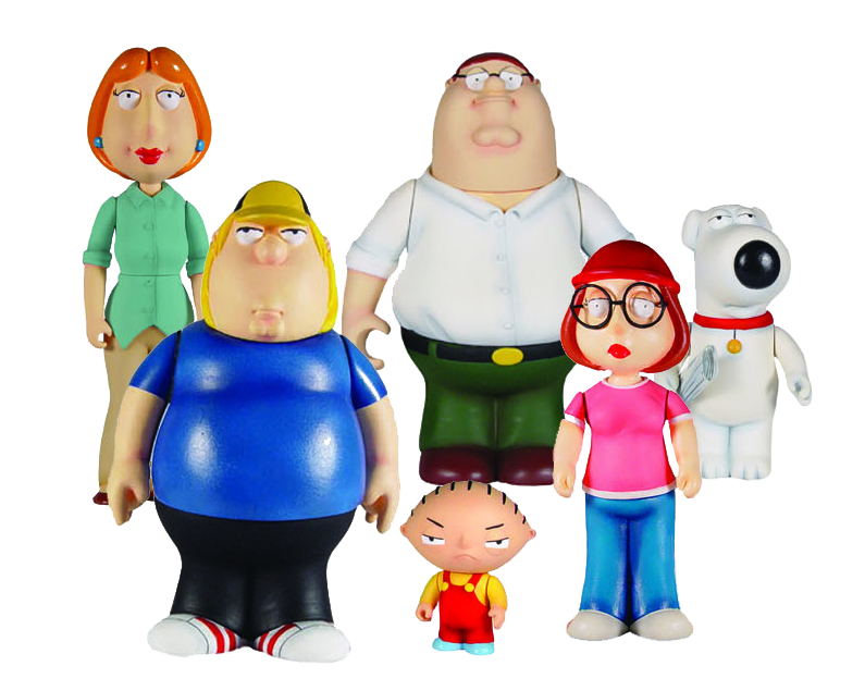 Family Guy. Ten years after its debut, the series is more popular than ever, and now you can add the Griffin family - Peter, Lois, Chris, Brian, Stewie, and Meg - to your collection. Each figure features a detailed sculpt and multiple points of articulation. Blister card packaging.