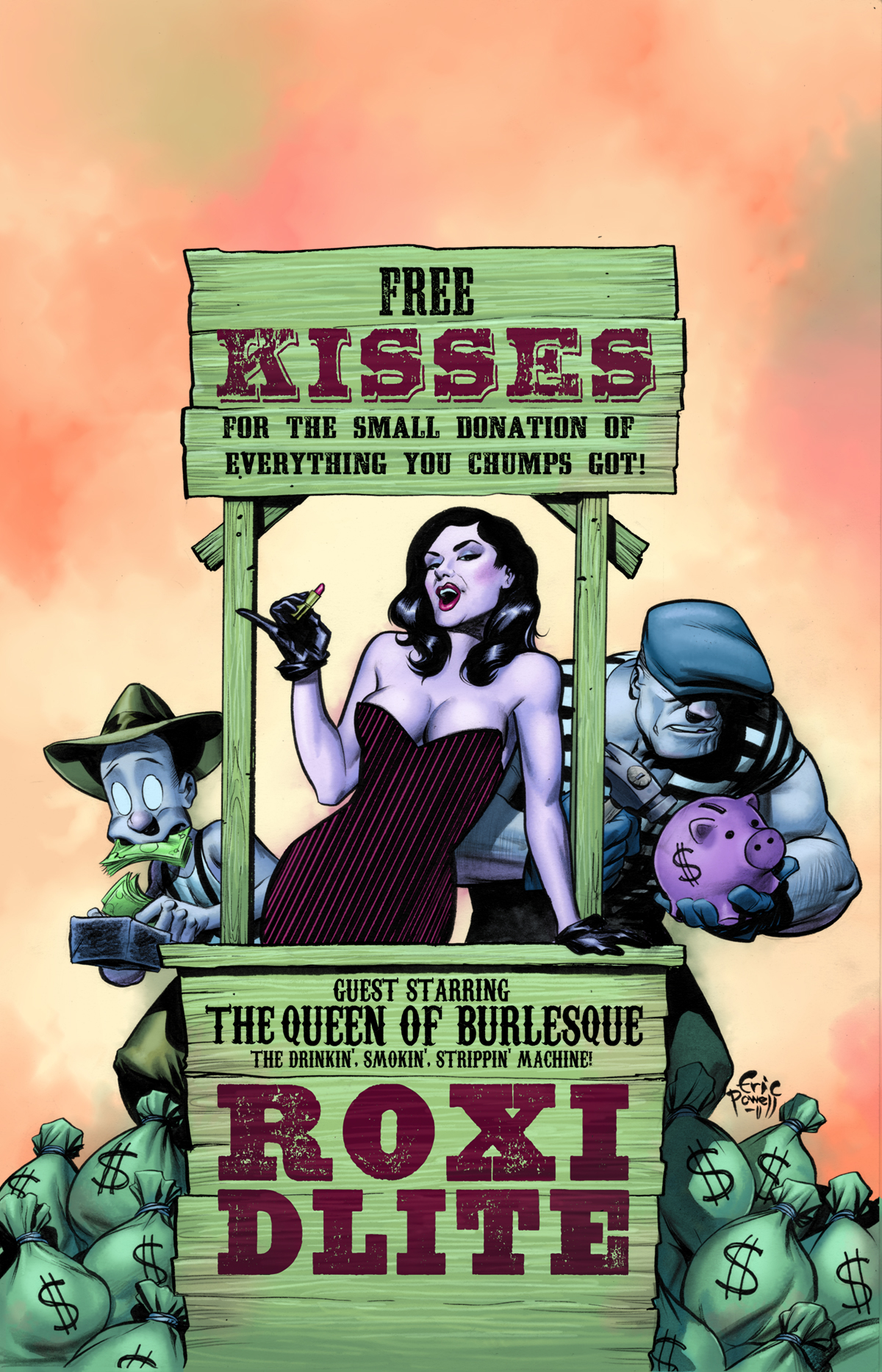 Zombie gangs, killer robots, beasts beyond reckoning, and stuck in the middle is Goon! But can the titular powerhouse resist the wicked allure of femme fatale guest star Roxi Dlite-the 2010 Queen of Burlesque? Will Franky be able to pick his tongue off of the ground before issue's end?! Find out the stunning and sultry answers in a new madcap issue of The Goon!