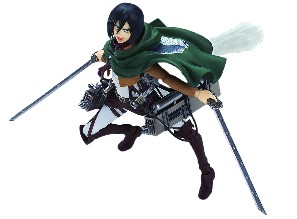 Mikasa Ackerman! Using the smooth yet poseable joints of figma, you can act out a variety of different scenes. She comes with three expressions including her standard emotionless expression, a shouting expression and an expression with clenched teeth. Her dual blades are included for combat scenes, along with her Vertical Maneuvering Equipment and smoke effects to recreate its use. The hooks connecting to a wire that shoots out from the equipment are also included, along with an optional mantle. An articulated figma stand is included, which allows for various posing options.