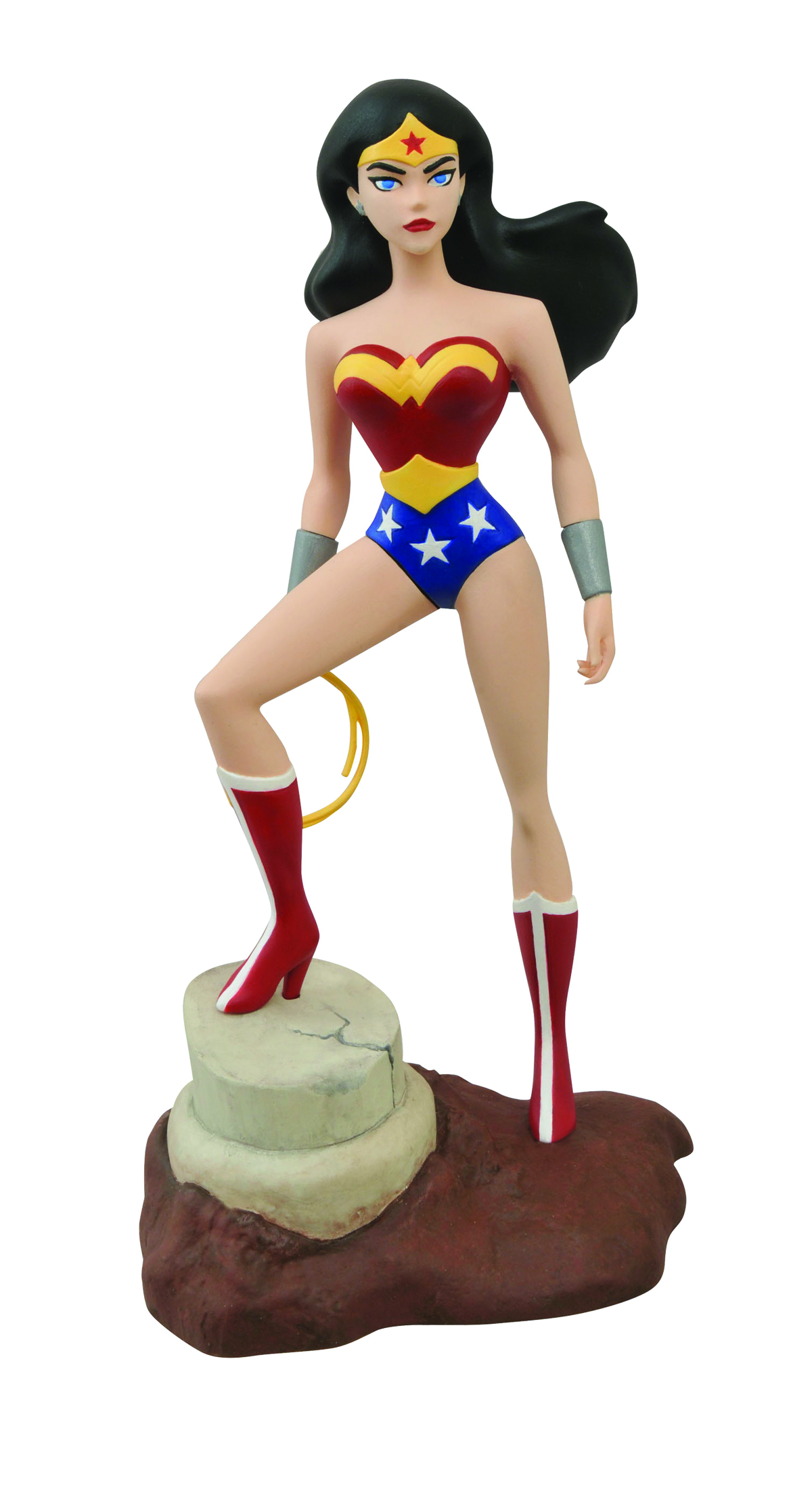 A Diamond Select Toys release! She's not your ordinary princess! As the daughter of the Amazon queen of Themyscira, Wonder Woman was granted strength and flight by the gods, and stands side-by-side with Batman and Superman as a member of the Justice League! This 9-inch PVC statue of Wonder Woman is based on her appearance in the animated series Justice League, and has her placing a raised foot on a broken column, golden lasso at the ready. It comes packaged in a full-color window box. Sculpted by Stever Varner Studios!