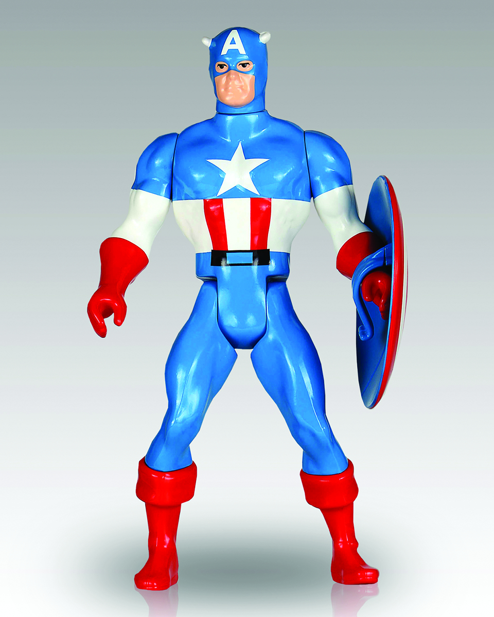 Secret Wars figures and reproduced in 12" scale, no detail for this jumbo-sized Captain America has been overlooked. Roto and injection molded and made of durable plastics, this fully-articulated jumbo figure includes a faithfully reproduced lenticular shield. And, of course, what would the Star-Spangled Avenger be without his trusty shield! To further capture the vintage feel, Gentle Giant has packaged this figure with a