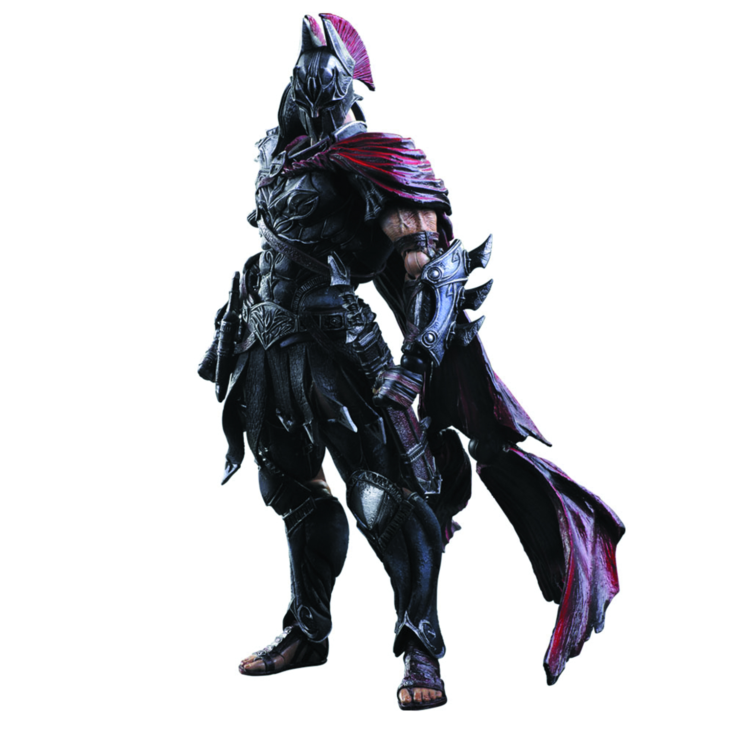 Batman. Heavy armor with an overwhelming presence in battle, along with battle scars and damage that draw the viewer in, evoke the intensity of battle. Each piece of equipment expands upon the regal imagery and foreboding visage. A brawny physique and dark color brings together the iconic characteristics of a Spartan warrior and Batman, in a finish reminiscent of a fine sculpture that captivates the viewer. Figure also includes display stand and interchangeable hand parts.