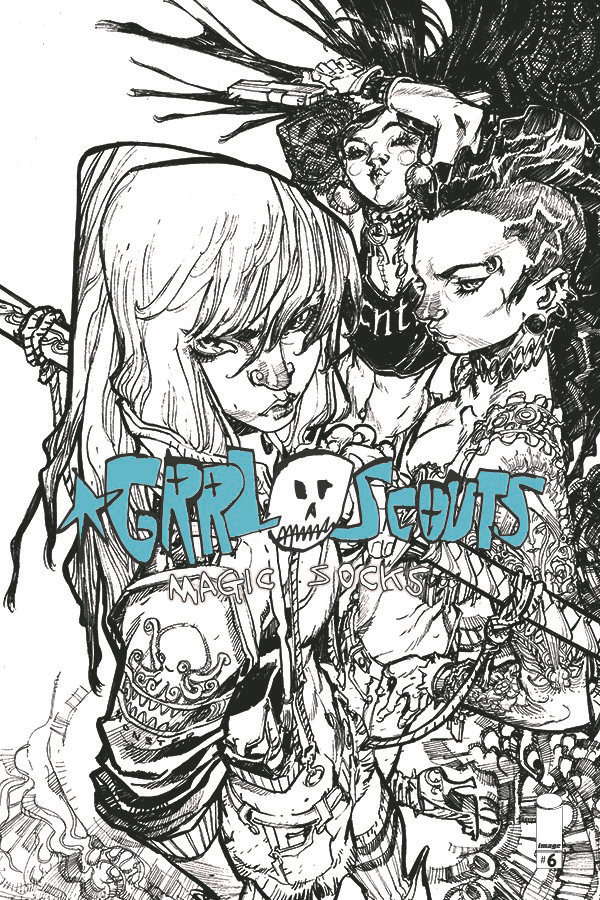The stunning conclusion to the epic MAGIC SOCKS saga! Daphne returns to Earth to hopefully save Gwen and Rita's butts. Will the Grrl Scouts finally resolve their differences in time to take out Josie and her murderous cult of teenage fans? This ish is stuffed to the gills with an action-packed story, bonus art, soundtrack, and sketchbook. Plus, a variant cover by artistic sensation ERIC CANETE!