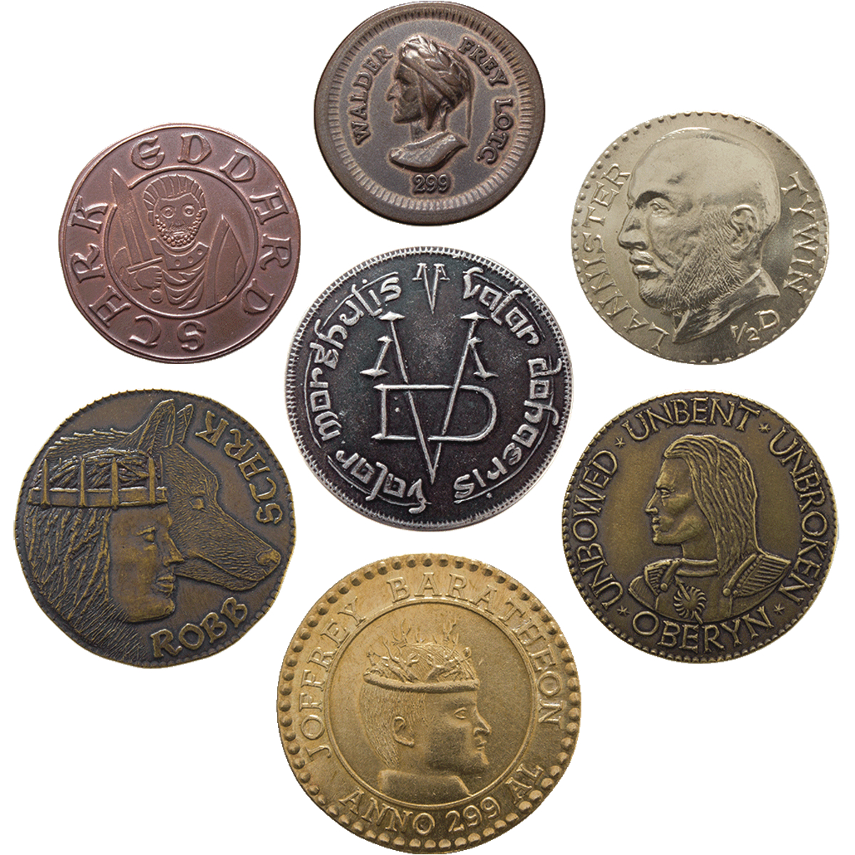 Death comes to all men in Westeros. This premium collection of coins features characters whose deaths we have witnessed. Many were great and terrible men, some were just boys. This set includes the Iron Coin of the Faceless Men, the Eddard Stark Half-Groat, the Robb Stark Half-Dragon, the Joffrey Baratheon Golden Dragon, the Oberyn Martell Half-Dragon, the Twyin Lannister Half-Dragon, and the Walder Frey Penny. The coins in this set from the world of George R. R. Martin are struck from solid brass, copper and iron, measure 2.1 to 2.9 cm in diameter, and weigh 2.9 to 11 grams. Coin artwork by Tom Maringer, Woody Maringer, Joe Paonessa, Greg Franck-Weiby, Stan Peterson and Ron Landis.