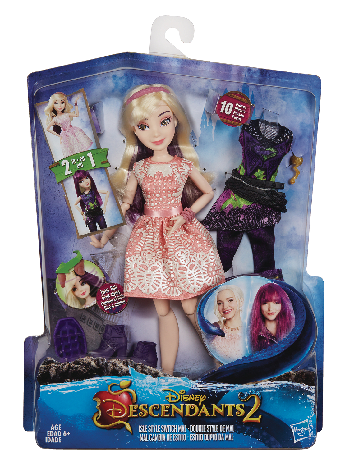 Disney's Descendants 2 with Isle Style Switch Mal! Kids have the awesome ability to make Mal a proper Lady of the Court in her Auradon look, or revert her back to her wicked ways with a twist of her hair to her Isle style! The twist-to-transform hairstyle feature is inspired by Mal's transformation in the movie, giving kids 2 fabulous looks in 1 doll! The Mal doll rocks 2 outfits and features movie-inspired fashion accessories.