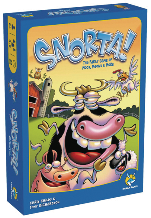 Get ready for laughter as your friends and family suddenly start sounding like they were born in a barn! In Snorta!, each player is given a barn tile with their secret animal on it and a hand of animal cards. When a card placed down matches on of the cards already on the table, those two players rush to say the animal sound of the other player, not the sound of the animal on the card. If you say the other player's sound first, you give them all the cards you've flipped onto the table in front of you. The first person to get all the cards out fo their hand is the winner!