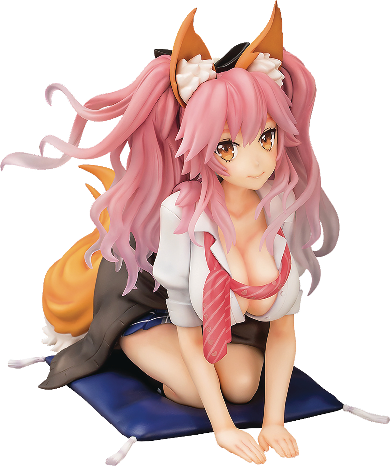 Tamamo no Mae wearing a school uniform, based on an illustration that was included as a store purchase bonus! The figure is posed kneeling on a cushion with her shirt buttons undone to reveal her impressive cleavage, with her cute twin-tailed hair sculpted and painted with great care to capture the original illustration as faithfully as possible!