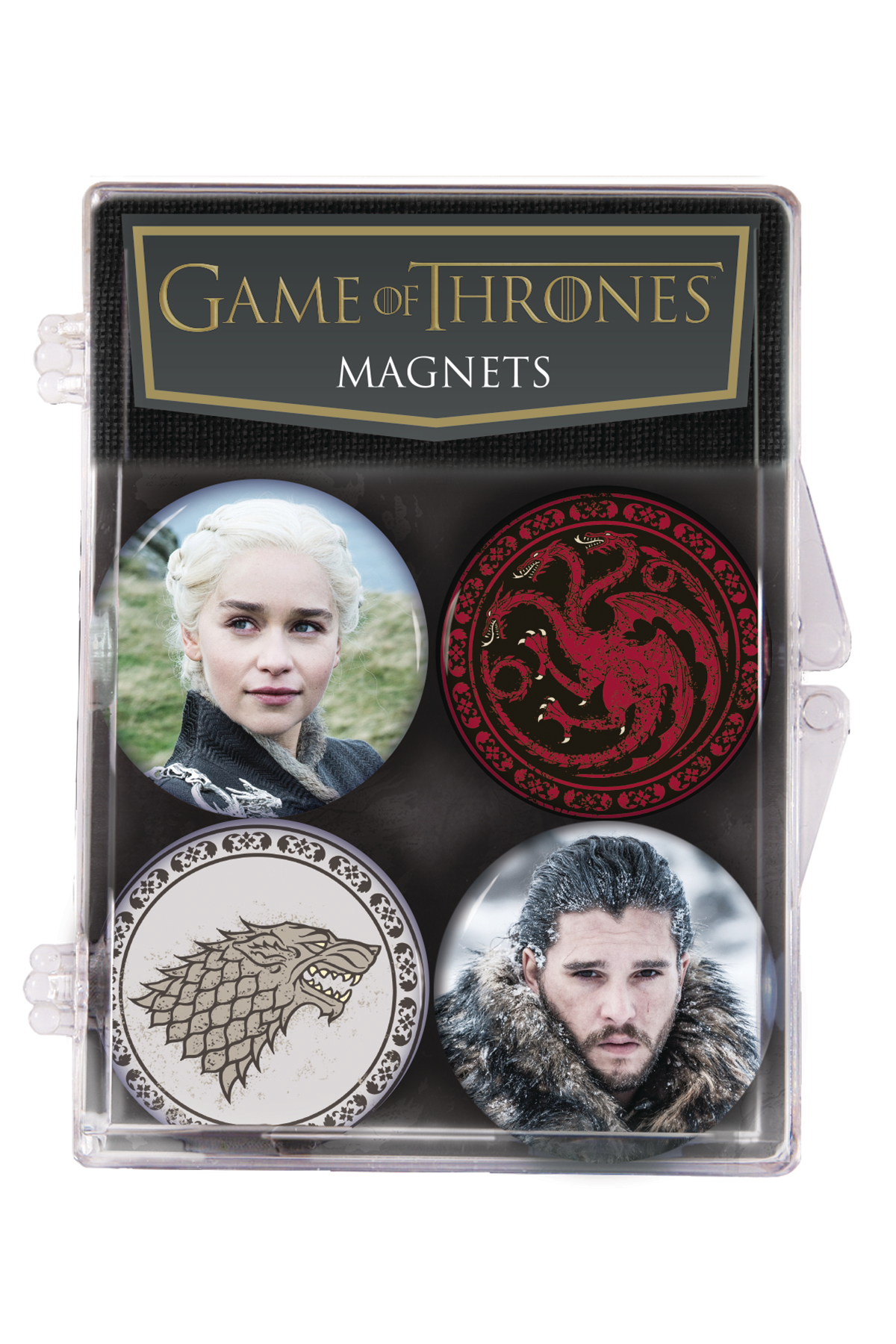 Four magnets; 2 houses. Stark and Targaryen sigils and images of Daenerys Targaryen and Jon Snow pair up in this set of 1.25" magnets. Packaged in a handy clear plastic hinged case.