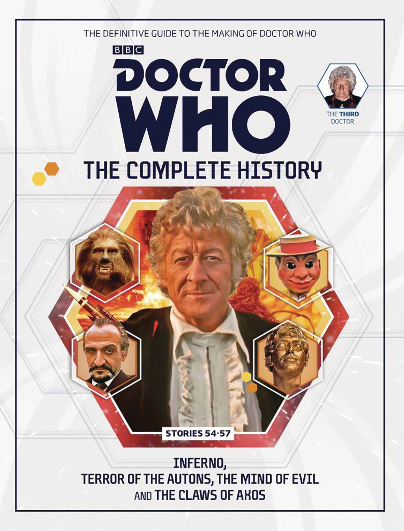 Doctor Who continues with this volume on the twelfth Doctor focusing on one story from season 7 and three stories from season 8: "Inferno," "Terror of the Autons," "The Mind of Evil," and "The Claws of Axos." Illustrated throughout with photographs from the archives and in full-color, this hardcover volume features story summaries, character and actor profiles, pre- and post-production notes, broadcast reaction, and much more.