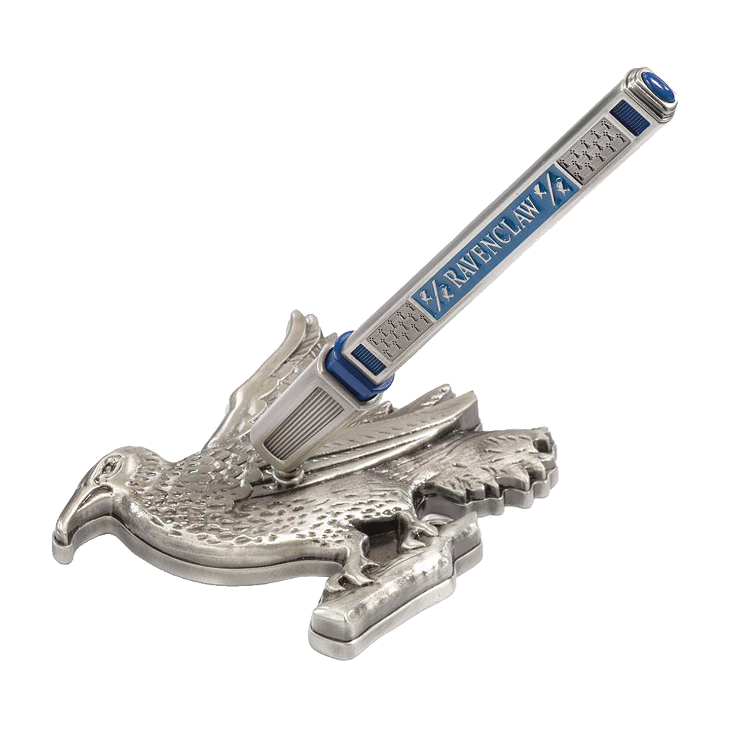 From The Noble Collection. A pen worthy of Rowena Ravenclaw herself, this intricately detailed, die-cast pen features a stand shaped like the Raven from the Ravenclaw house crest. Perfect for the witty Ravenclaw in your life, the stand measures about 4" in length.