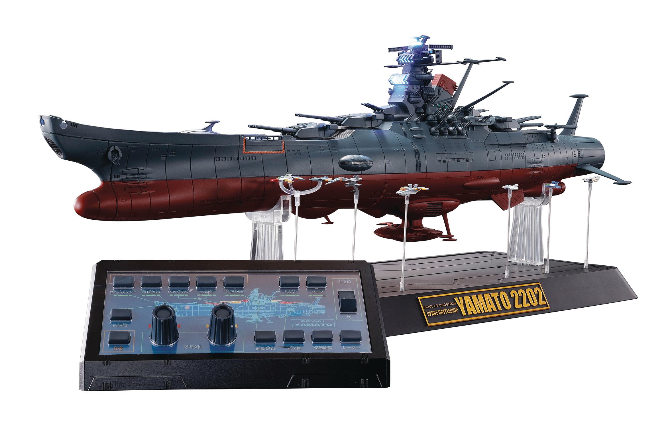 Soul of Chogokin series! It's packed with features, including light-up Wave Motion Gun, engine, and bridge, plus motorized turrets. A remote control lets you play key lines recorded by the voice actors for Susumu Kodai and Yuki Mori, plus a variety of other effects and music. The set includes the