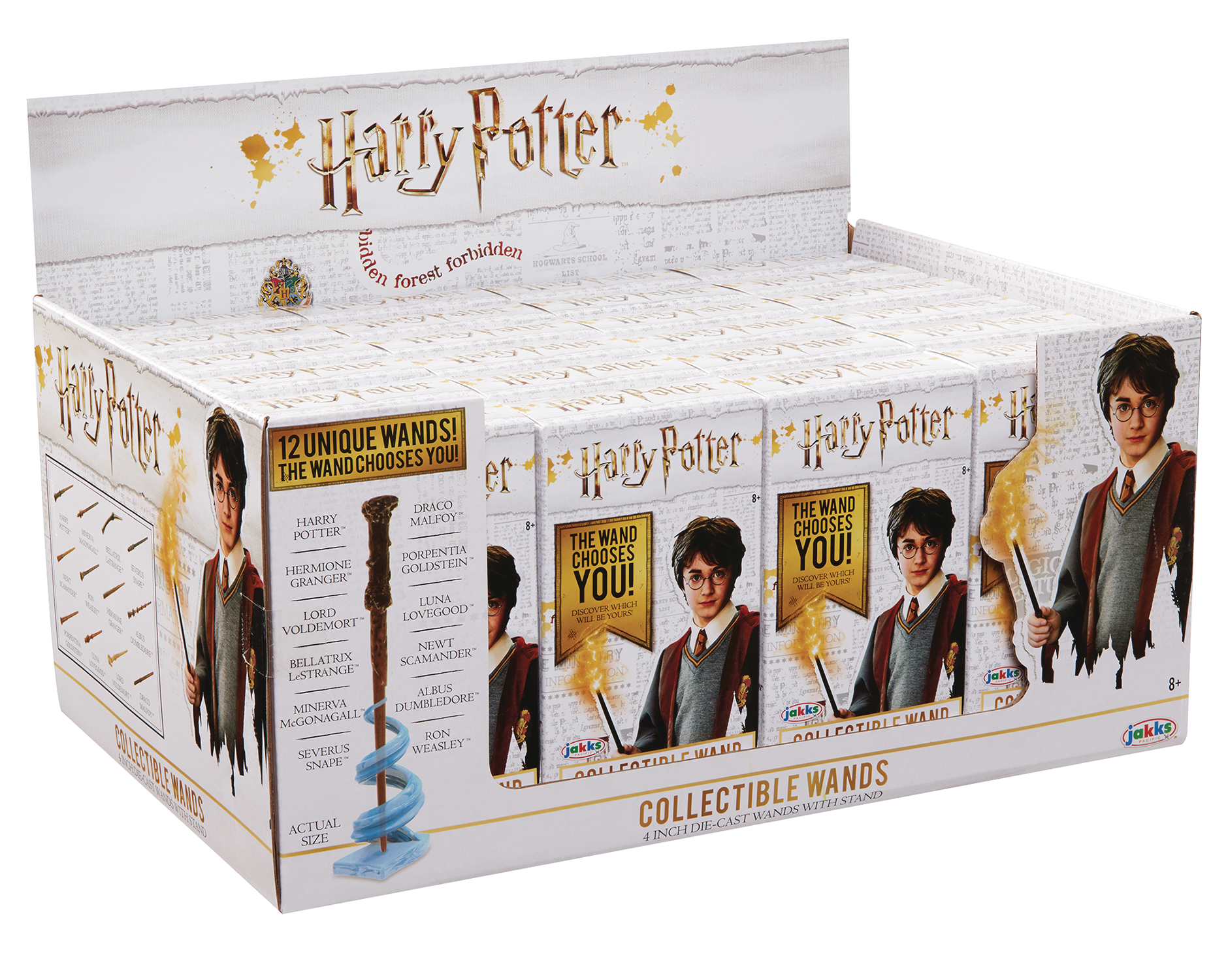 From Jakks Pacific. You can collect die-cast replica wands of your favorite characters from the Harry Potter and Fantastic Beast series! There are 12 wands to collect in the set, including the wands of Harry Potter, Hermione Granger, Ron Weasley, and other wizards. These wands are 4-inch scale and include a stand for display. Each wand is packed in a blind mystery box. The wand chooses the wizard each time!