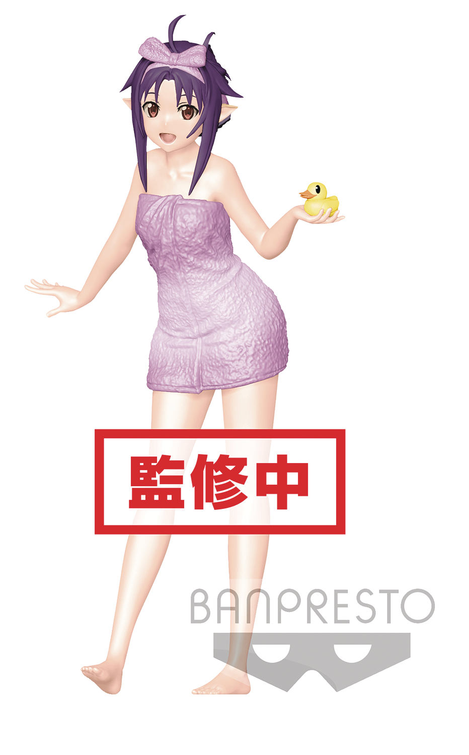 From Banpresto. Sword Art Online's Yuuki Konno is enjoying a little downtime in this cute bathtime figure from Banpresto's EXQ Figure collection! The non-articulated figurine features Yuuki in a pretty pink towel with her hair tied up to keep it out of the water as she poses with an adorable rubber ducky.