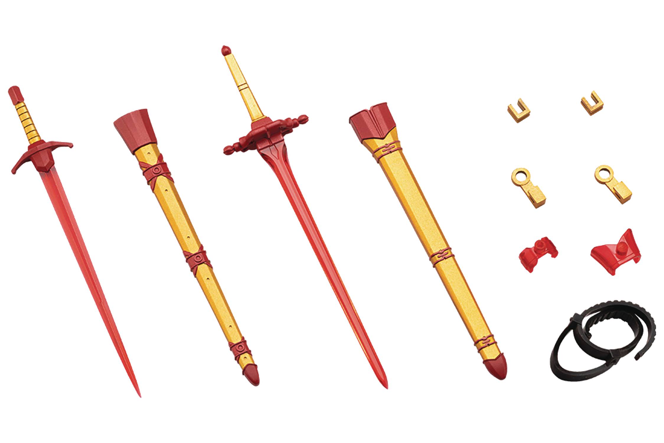 Keeping the same base design as VIRTUOUS STYLE 01 SWORD SET A, this set reimagines the swords as magical weapons using clear red blades, metallic red guards and pommels, and gold grips.