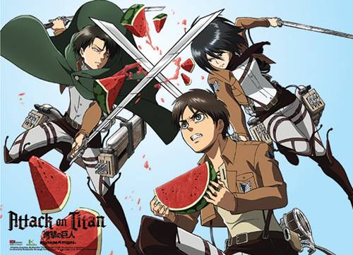ATTACK ON TITAN EREN MIKASA LEVI MELON FIGHT WALL SCROLL (NE