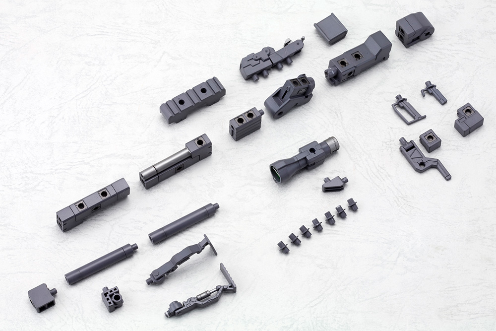 Each part can be rearranged to create a variety of original weapons, and by combining multiple parts, the barrel can be extended even further. A spring gimmick allows it to be deployed from the folded mode with a single touch. The parts are connected using 3mm joints, allowing for fun combinations with items from the "Weapon Unit" series and "Frame Arms" series. Order yours today!