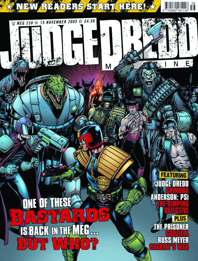Three new stories from the future-shocked world of Judge Dredd! "Warzone" part 1 of 4 comes to us from John Wagner and P.J. Holden. Dredd falls in with a positronic platoon in this follow-on from the hit 2000 ad saga "Mandroid." Plus, there's a stench of death in the radlands, and it's headed koburn's way in part 1 of "Cursed Earth Koburn: Malachi" from Gordon Rennie & Carlos Ezquerra. Later, the Heelands Hoolie returns, and his target is Stinkin' Billy in part 1 of Young Middenface: A Scottish Sojer" by Alan Grant and Shaun Thomas. Plus, Judge Anderson, "Charley's War" continues, and more! In issue #241, Brian Bollan is interrogated. And in issue #242, new series "Meet Darren Dead" debuts from Rob Williams & John Higgins.