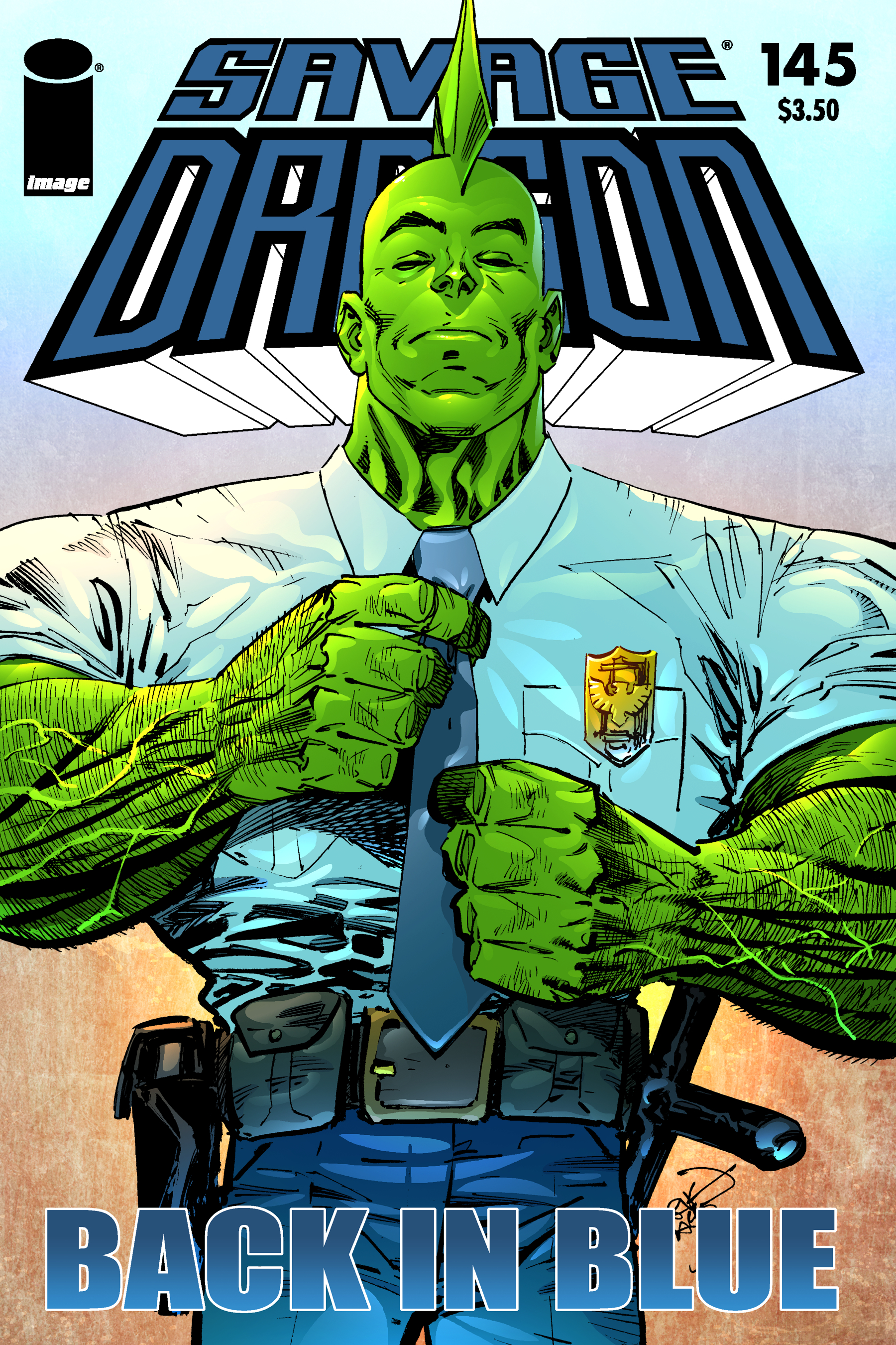 Savage Dragon goes back to his roots! Nearly 12 years after walking off the job as a law enforcement officer Savage Dragon rejoins the Chicago Police Department. It's a great jumping on point for new readers and old, and it helps pave the way for IMAGE UNITED. The Vicious Circle is reborn and Captain Frank Darling turns to the one man he knows can get the job done: The Dragon! It's history in the making, boys and girls! This issue of SAVAGE DRAGON comes with our highest possible recommendation!