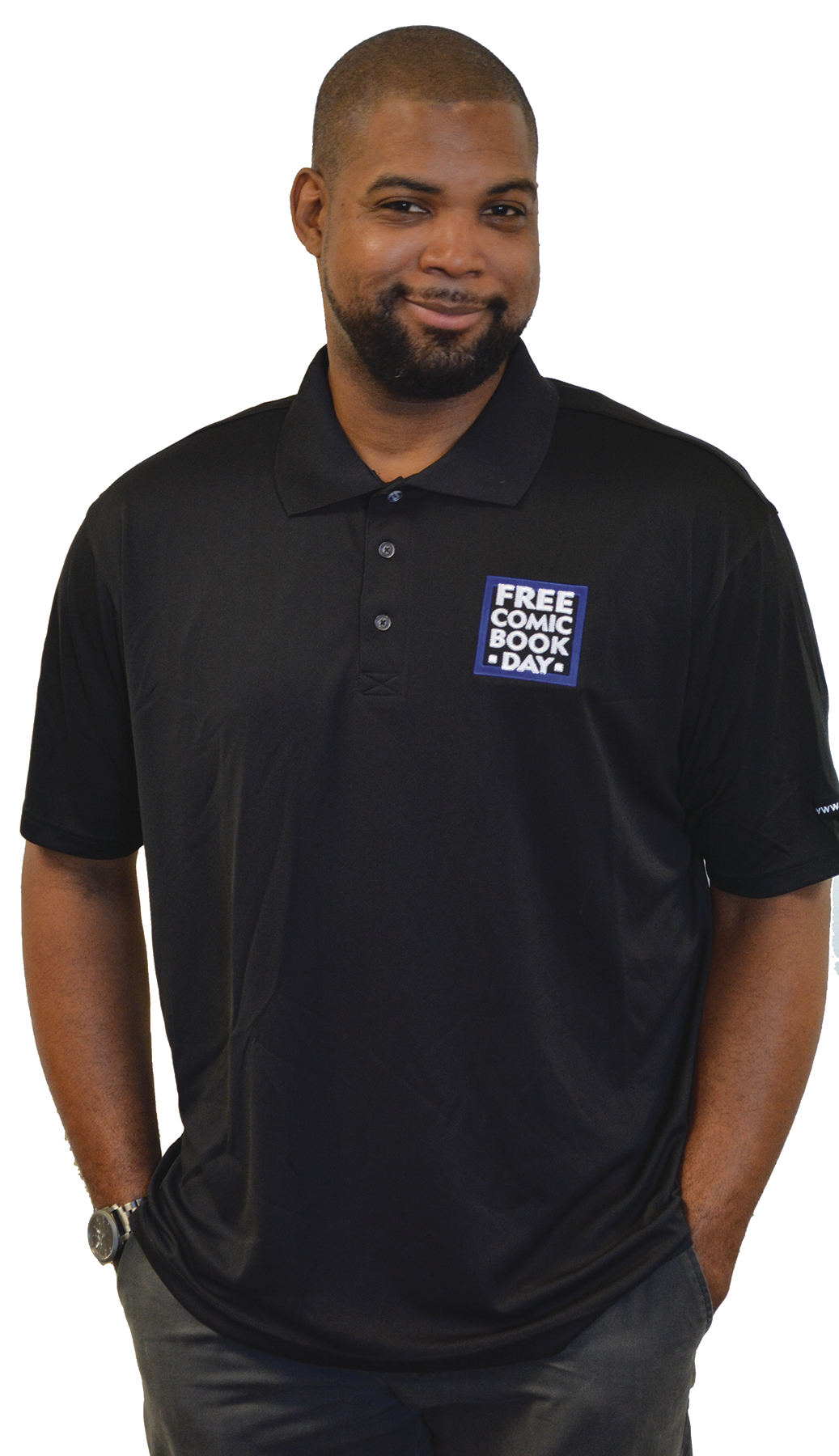 This is a new, high-quality black polo shirt is made of Sport-Tek© Dri-Mesh and features the Free Comic Book Day logo on the left chest. The event URL -