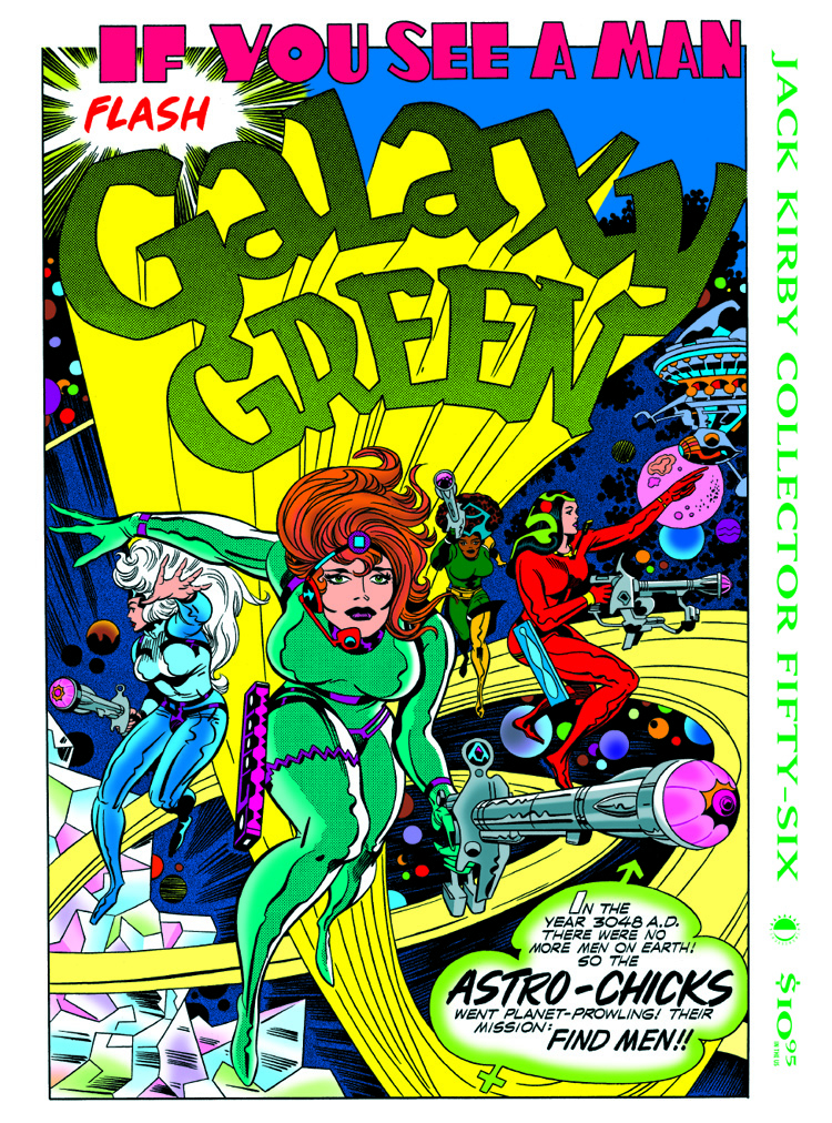Boy Explorers story, "Trip to the Moon", two Kirby Tribute Panels, plus Mark Evanier and our other regular columnists, pencil art galleries, and more! All behind two Kirby covers (the "Galaxy Green" presentation, inked by Mike Royer, and the unseen cover for