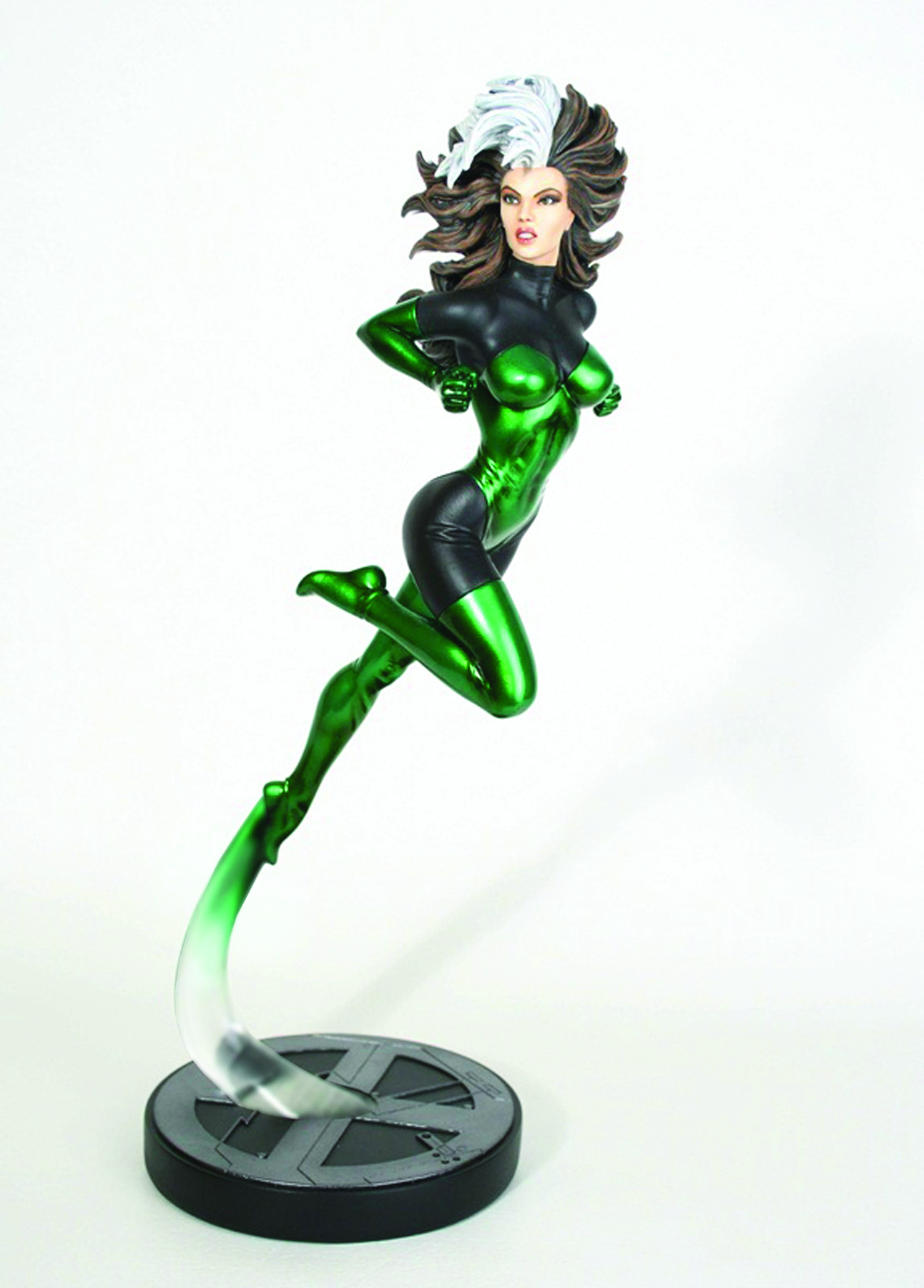 A Bowen Designs Sculpt! The enigmatic mutant Rogue can, with just a touch, absorb the powers, perceptions, and consciousness of another being. To keep herself from accidentally taking another's powers, she wears a bodysuit to keep her from accidentally touching another. This stunning 14 1/2" tall statue of Rogue, sculpted by Mike Cusanelli, depicts the mutant in her late-80s green and black costume.