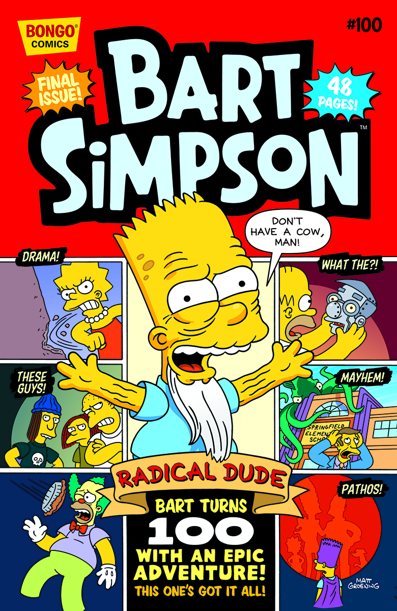 "Bart's Odyssey": Bart Simpson turns 100! When Homer is put in charge of security for Mr. Burns' secret R&D division, he inadvertently unleashes a series of events that threaten Springfield's very existence! If that's not bad enough, an all-too-familiar evil from Springfield's distant future arrives amid the chaos to stake his claim! But wait! Yet another mysterious figure from the future travels back to a current-day Springfield with the town on the brink of destruction! Will this stranger aid the embattled citizens in their darkest hour or make them eat his shorts? Join Bart Simpson's centennial celebration, capping off its illustrious and illustrated run with a final issue (for now)! It's a 48-page senses-shattering sendoff that will shake Springfield and