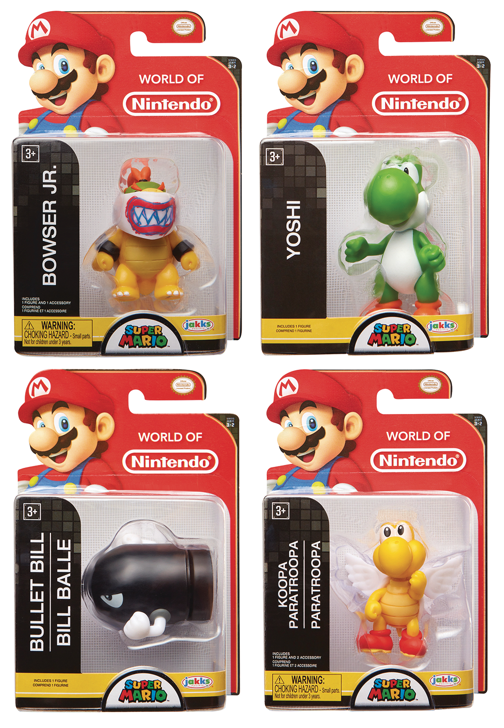 Super Mario figure line with multiple points of articulation. These iconic, authentic figures are sure to please kids and collectors alike! collect them all! for ages 3 and up. Choose from 2 1/2" tall figures of Green Yoshi, Bullet Bill, Red Para Troopa, and Boswer Jr.