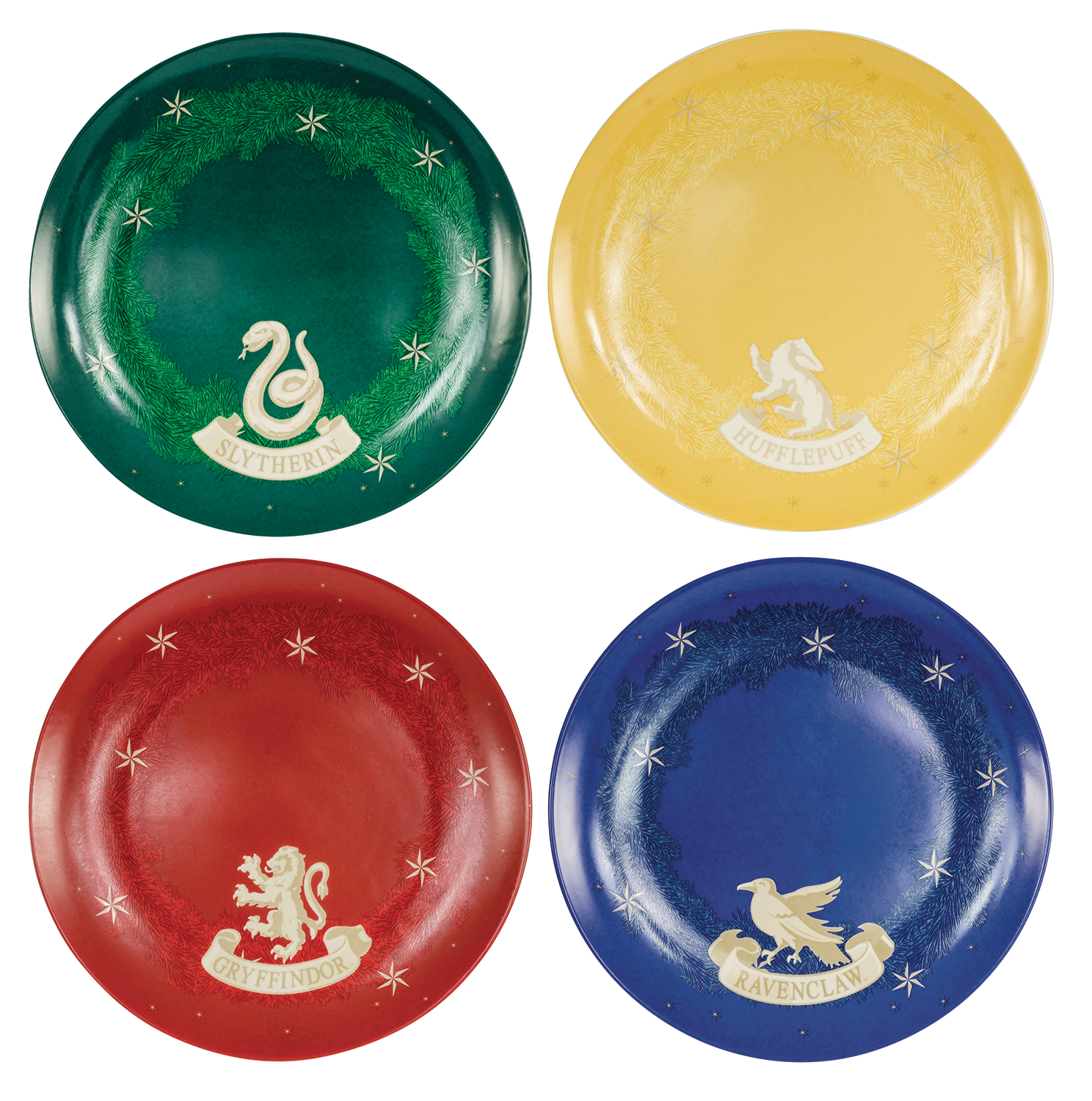Feast time in the Great Hall! Stack your plate with roast beef, chicken, casserole, and Yorkshire pudding! This plate set from Harry Potter features one for each house: color coordinated and complete with the house name, mascot and a design of wreath with stars. This ceramic 4-plate set is microwave and dishwasher safe. Available in 7" and 10 1/2" plate sizes.