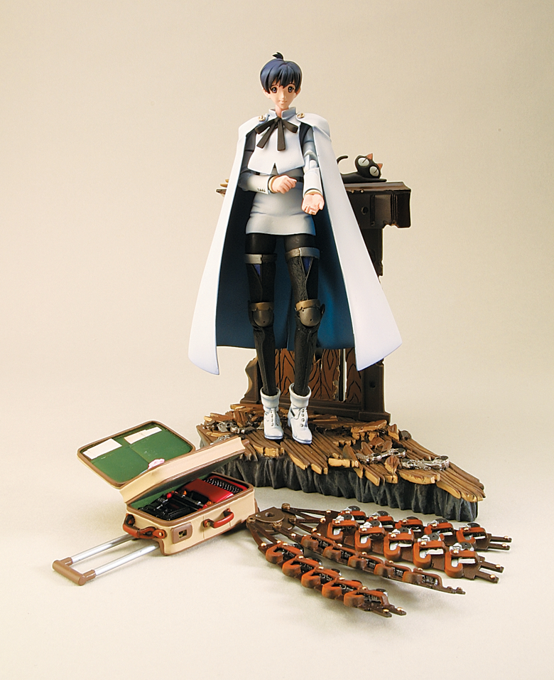 Meryl Stryfe, the insurance girl sent to keep a 24-hour surveillance on Vash the Stampede in an effort to lessen the damage he causes to the towns through which he passes. The Meryl figure stands approximately 5" tall and includes a removable cloak that conceals her high-tech derringer holster rack (with 20 removable derringers)! Also included is a multi-part suitcase filled with miscellaneous accessories, a 3-D display stand depicting a bullet-riddled counter, and a figure of Kuroneko the black cat, sculpted in a "hit-the-deck" position for gunfight scenes! Original Japanese blister card packaging.
