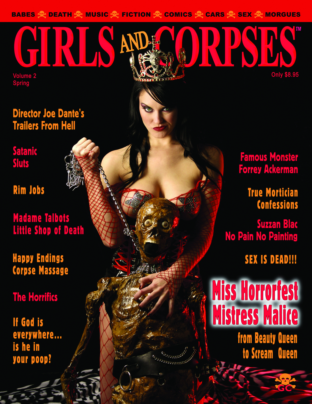 This issue's a beauty! Here she is... Miss Horrorfest-Mistress Malice on our rotting cover! We follow her fairy-tale dream from Texas beauty queen to L.A. scream queen. Also, this rotting issues unearths: Happy Endings Corpse Massage, Director Joe Dante's Trailers From Hell, Madame Talbot's Little Shop of Death, Famous Monster Forrey Ackerman, Satanic Sluts, the band