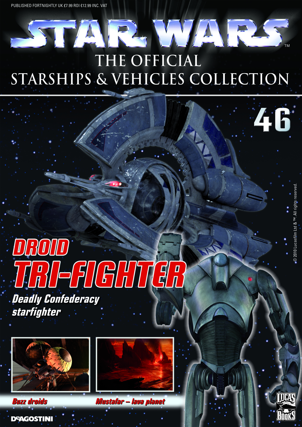 The Star Wars: The Official Starships and Vehicles Collection Magazine brings fans superbly detailed, painted metal models of the most amazing starships and land vehicles from George Lucas' mythic Star Wars films. Each comes with a copiously illustrated magazine that relates the history of the vehicle, its pilots or crew, and full technical specifications. Readers will also uncover information on the other fascinating craft from the Expanded Universe of the novels and comics, plus the inside story on the making of the films. Choose from the Slave-I (#19), General Grievous' Starfigher (#20), the Turbo Tank (#45), and the Droid Trifighter (#46). This month, fans can also fill in gaps in their collection with the Starfighter 2-Pack (#3), the AT-AT (#4), the Tantive IV (#29), and the AT-RT Walker (#30).