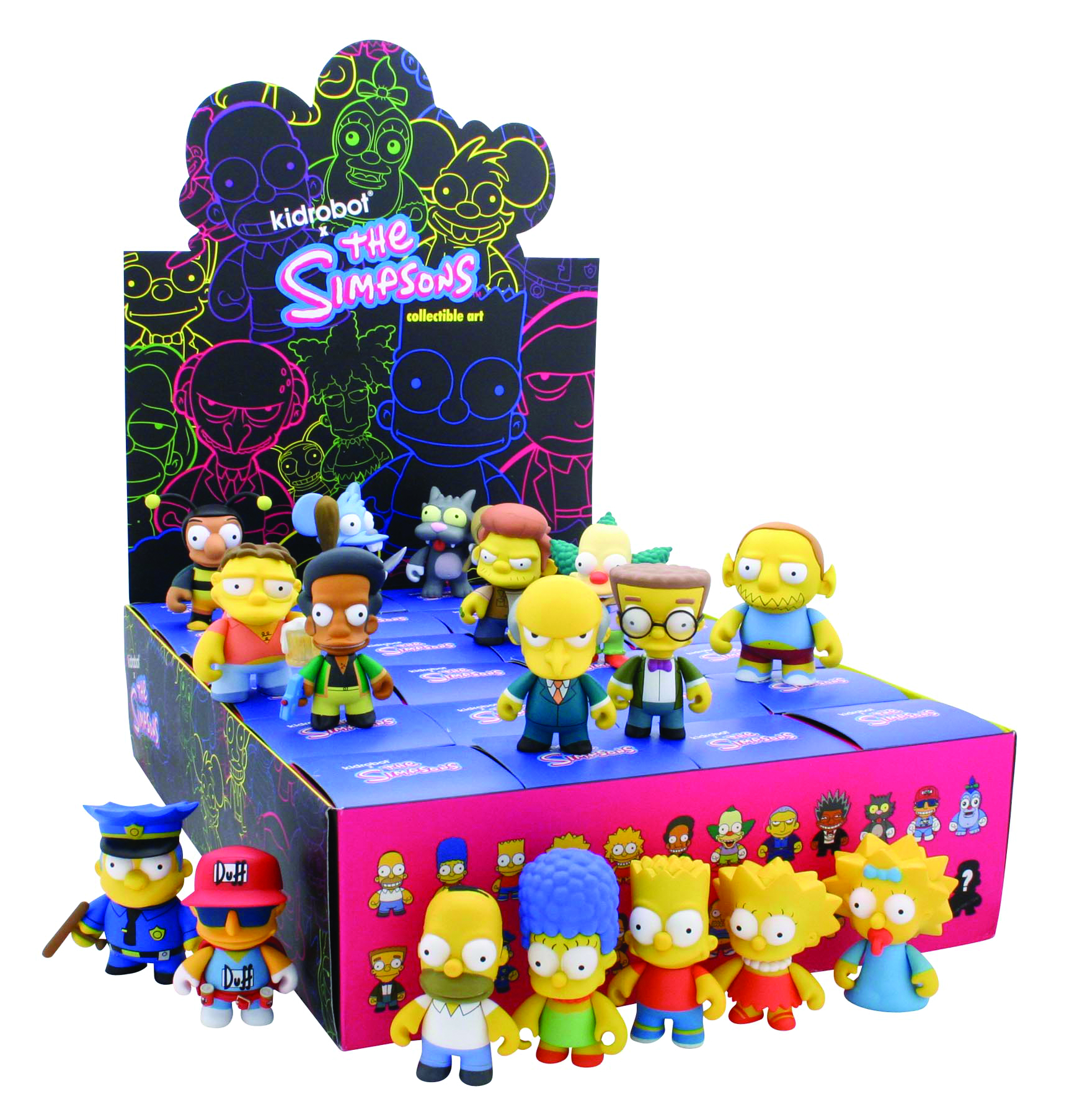 Simpsons creator Matt Groening to bring your favorite Springfield citizens to vinyl in their biggest mini-figure series yet! From Homer to Bart to Sideshow Bob, 24 iconic animated characters, including 3 chase figures, can be yours! Each figure stands 3" tall. Blind mystery box packaging.