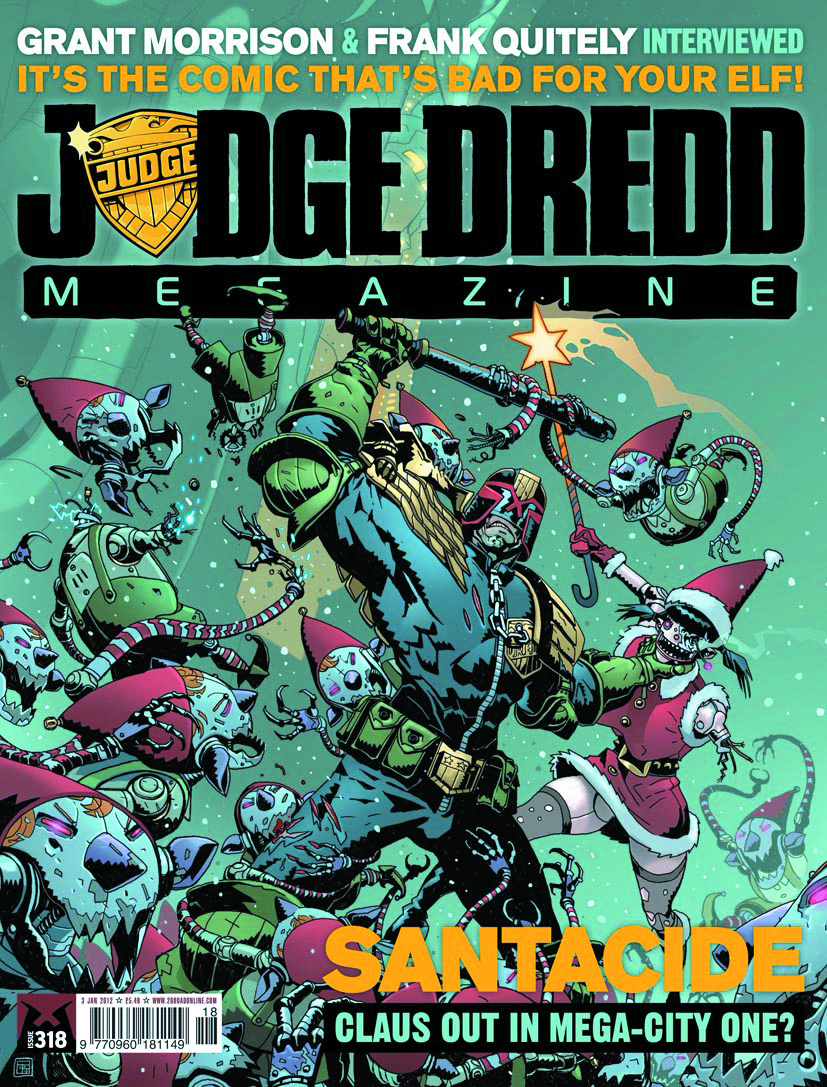 More action and adventure in the future-shocked world of Judge Dredd! A new Dredd story starts in this issue - meet the latest force for justice, "The Adjudicators" by Simon Spurrier and Carlos Ezquerra. In addition, there's the usual interviews, reviews, and more - and in the bagged graphic novel this month, mad gods and Englishmen in